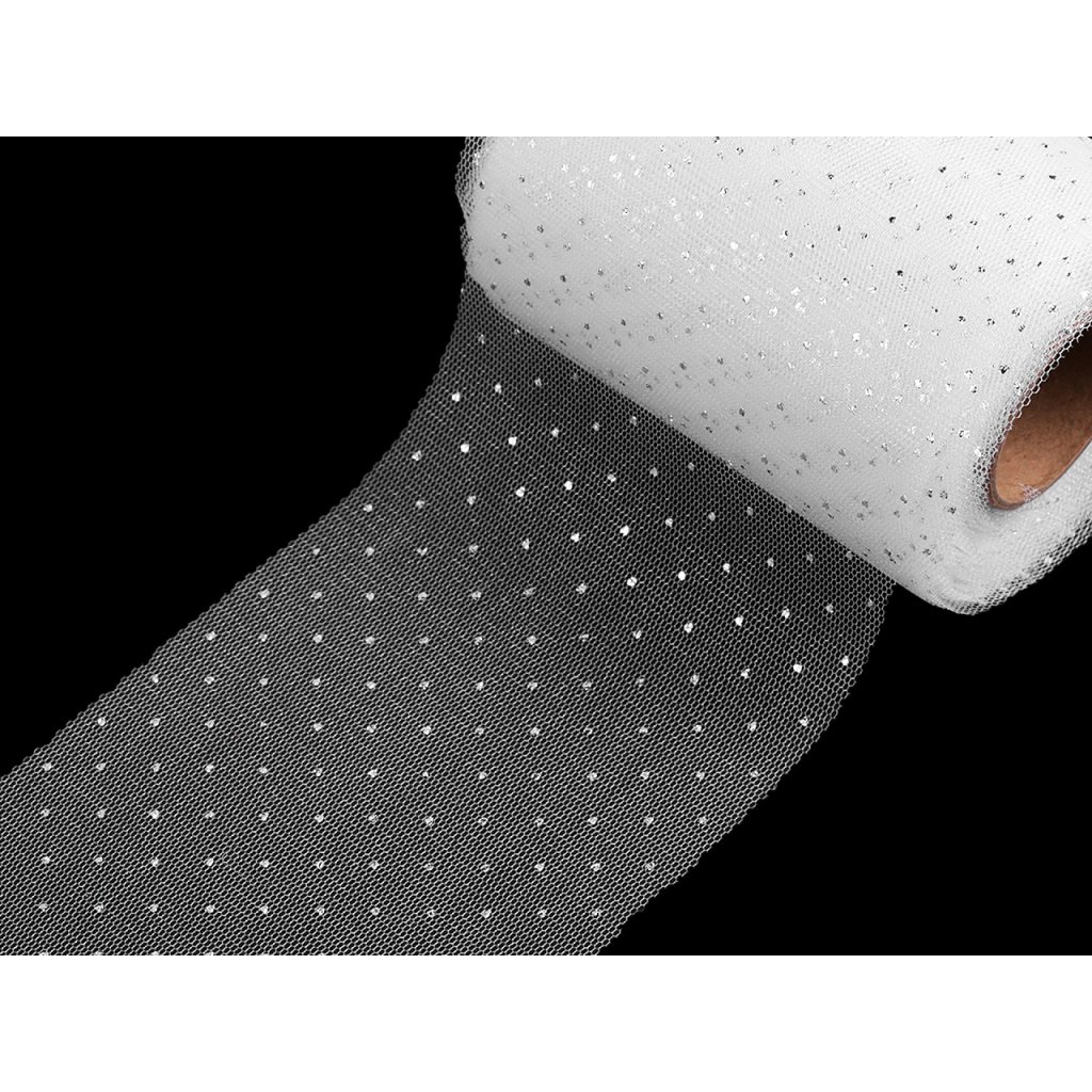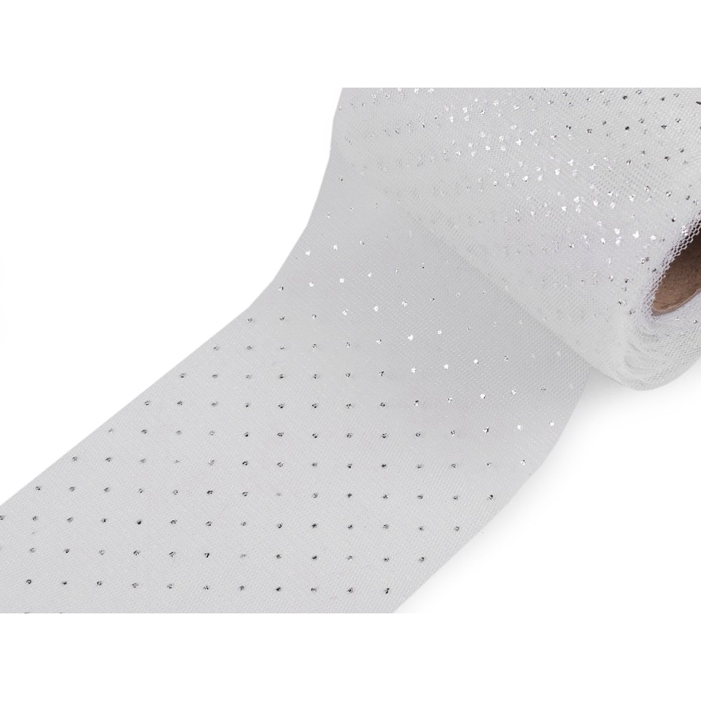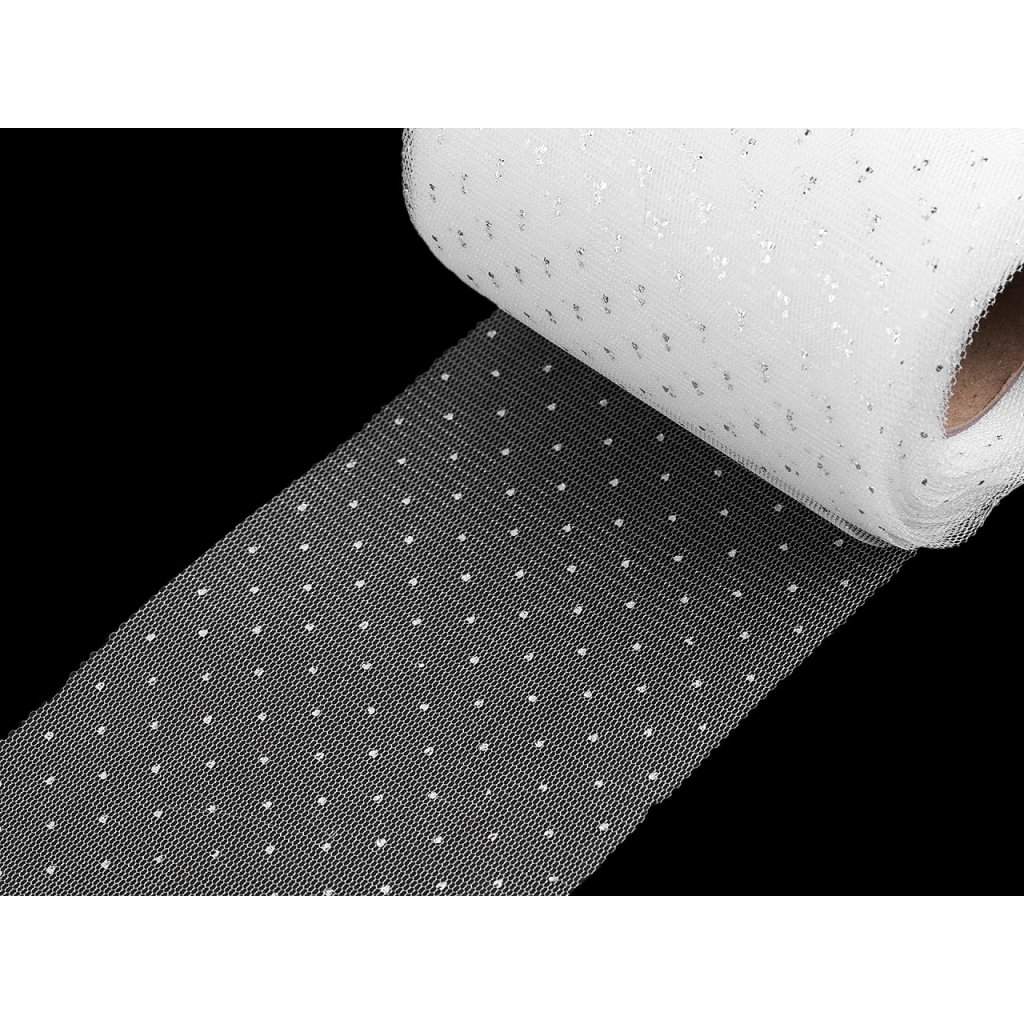Široká tylová stuha je po celé délce ozdobená stříbrnými puntíčky, díky kterým se elegantně třpytí. Je oboustranná, velice poutavá, tyl dodává stuze vzdušnost a lehkost, což ji činí ideální pro různé dekorační účely.