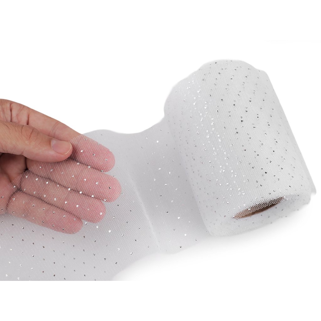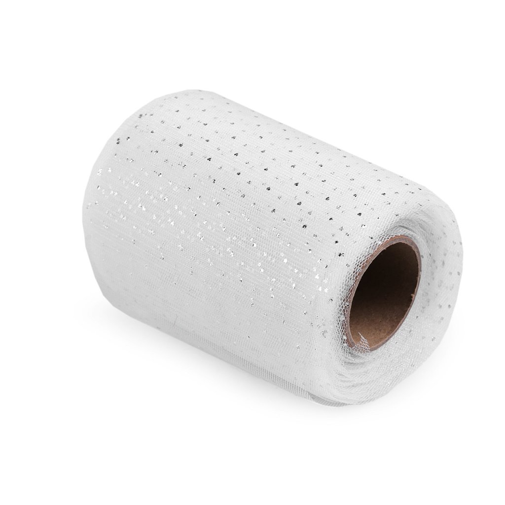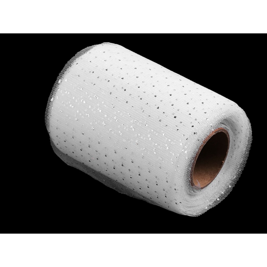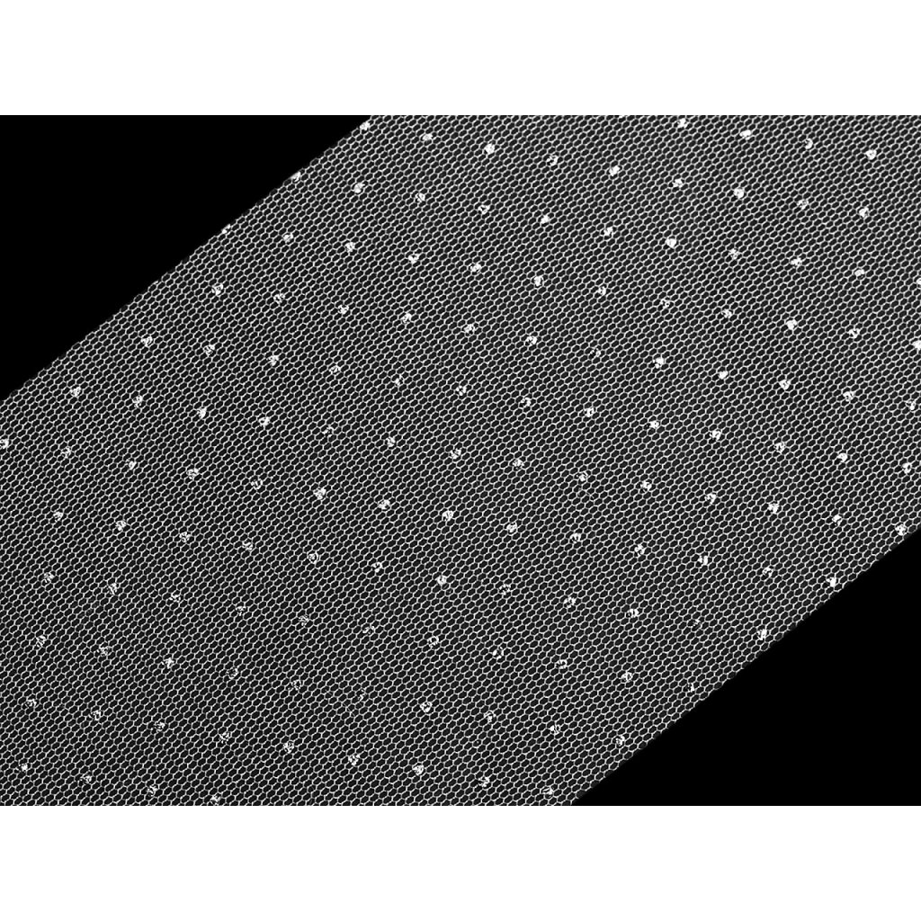 Široká tylová stuha je po celé délce ozdobená stříbrnými puntíčky, díky kterým se elegantně třpytí. Je oboustranná, velice poutavá, tyl dodává stuze vzdušnost a lehkost, což ji činí ideální pro různé dekorační účely.