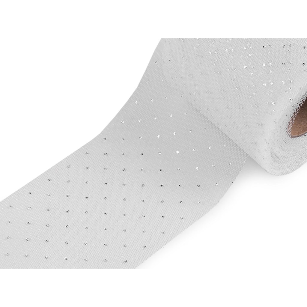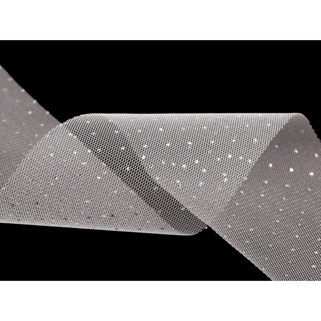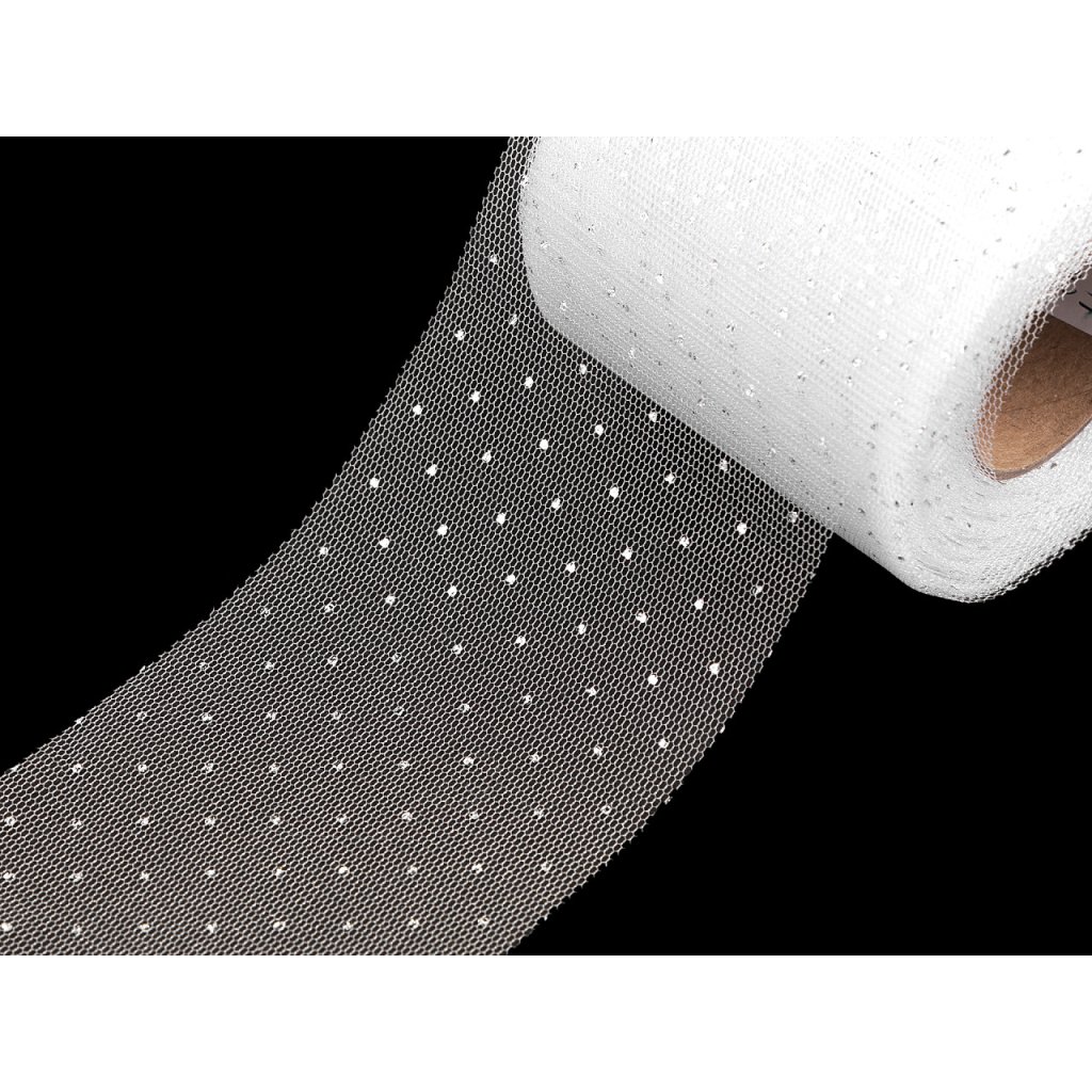 Široká tylová stuha je po celé délce ozdobená stříbrnými puntíčky, díky kterým se poutavě třpytí. Je oboustranná, velice poutavá, tyl dodává stuze vzdušnost a lehkost, což ji činí ideální pro různé dekorační účely.