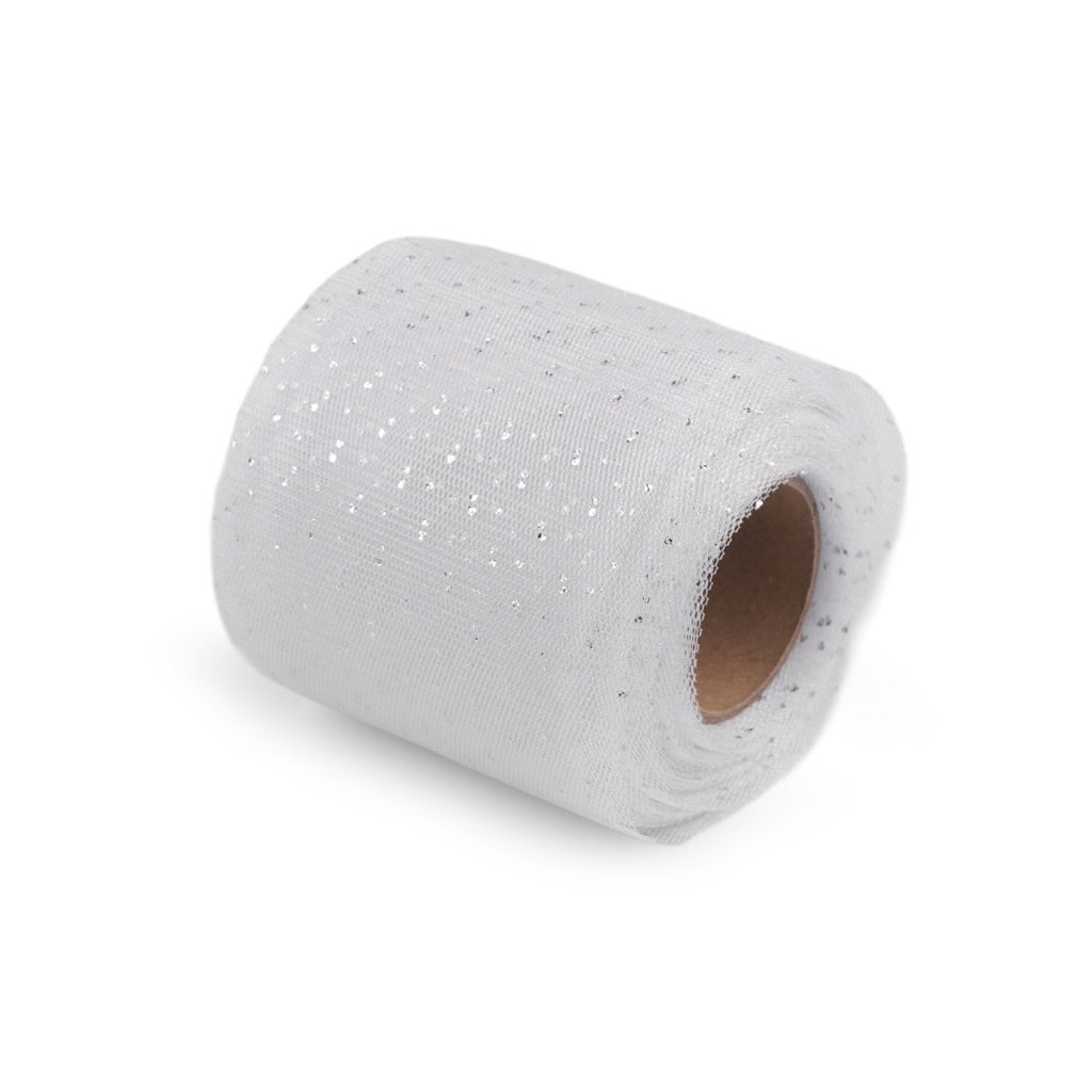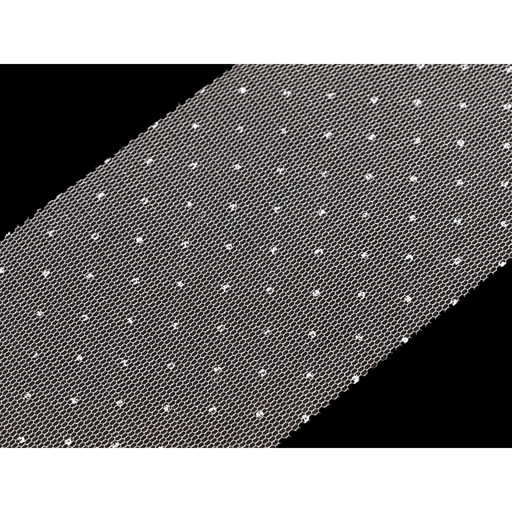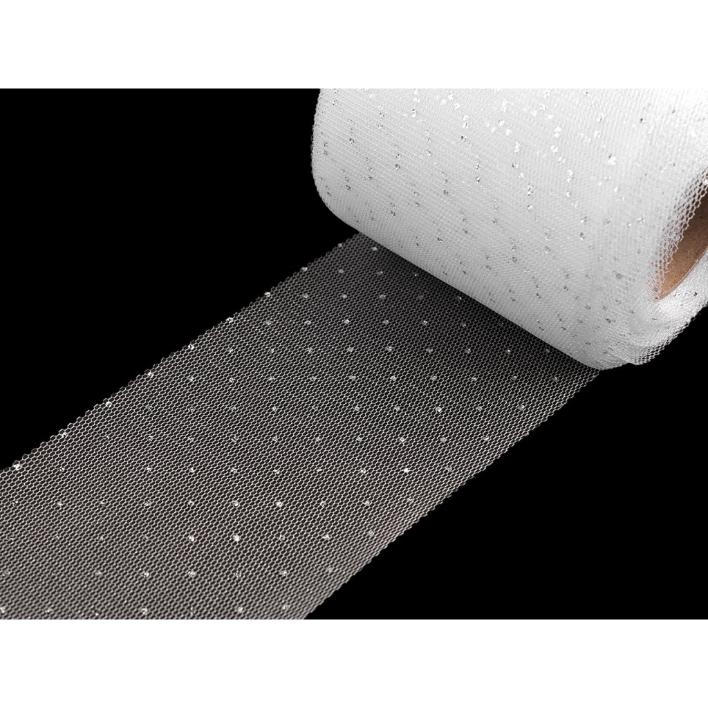 Široká tylová stuha je po celé délce ozdobená stříbrnými puntíčky, díky kterým se poutavě třpytí. Je oboustranná, velice poutavá, tyl dodává stuze vzdušnost a lehkost, což ji činí ideální pro různé dekorační účely.