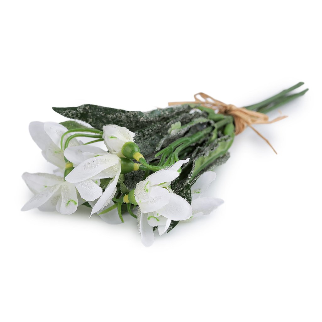 Svazek umělých sněženek vynikne ve váze, ale také v květinových vazbách, věncích a jarních aranžmá. Zajímavý efekt sněženkám dodávají drobné transparentní kuličky, které působí jako námraza. Uvnitř stonků je drát, který se dá tvarovat.