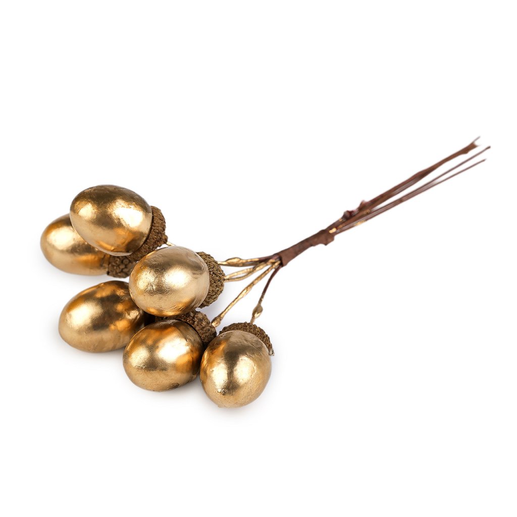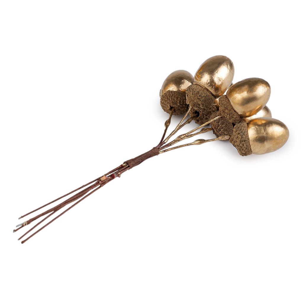 Metalické žaludy jsou vyrobené z polystyrenu, kalíšek je přírodní. Díky drátku je manipulace s nimi jednoduchá a umožňuje snadné zakomponování do jakékoliv dekorace. Žaludy vyniknou v podzimních vazbách, věncích, na svícnech apod.