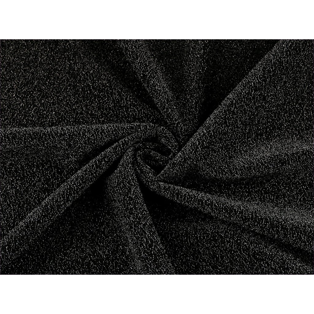 Třpytivý úplet je protkaný luxerem, který mu dodává slavnostní vzhled. Je splývavý, lehký, z rubové strany hladký a pruží všemi směry. Neprosvítá.