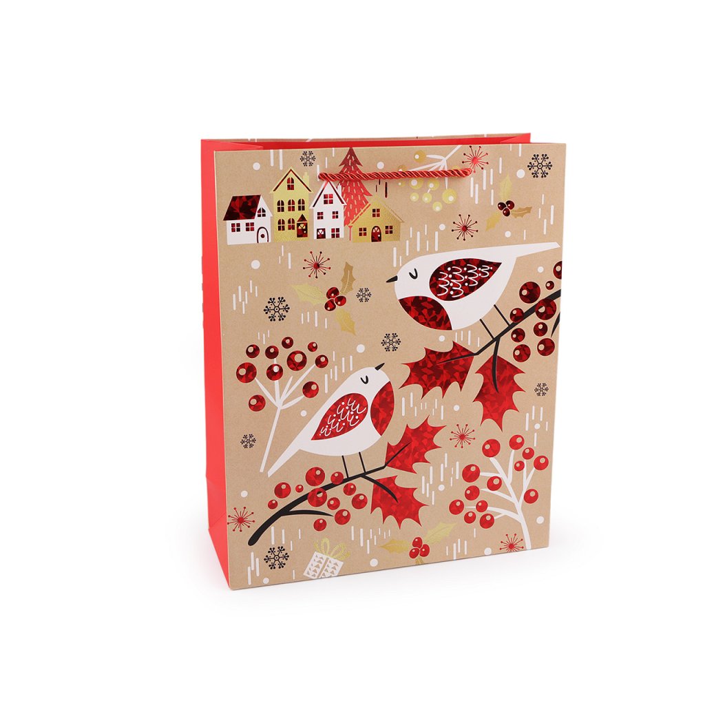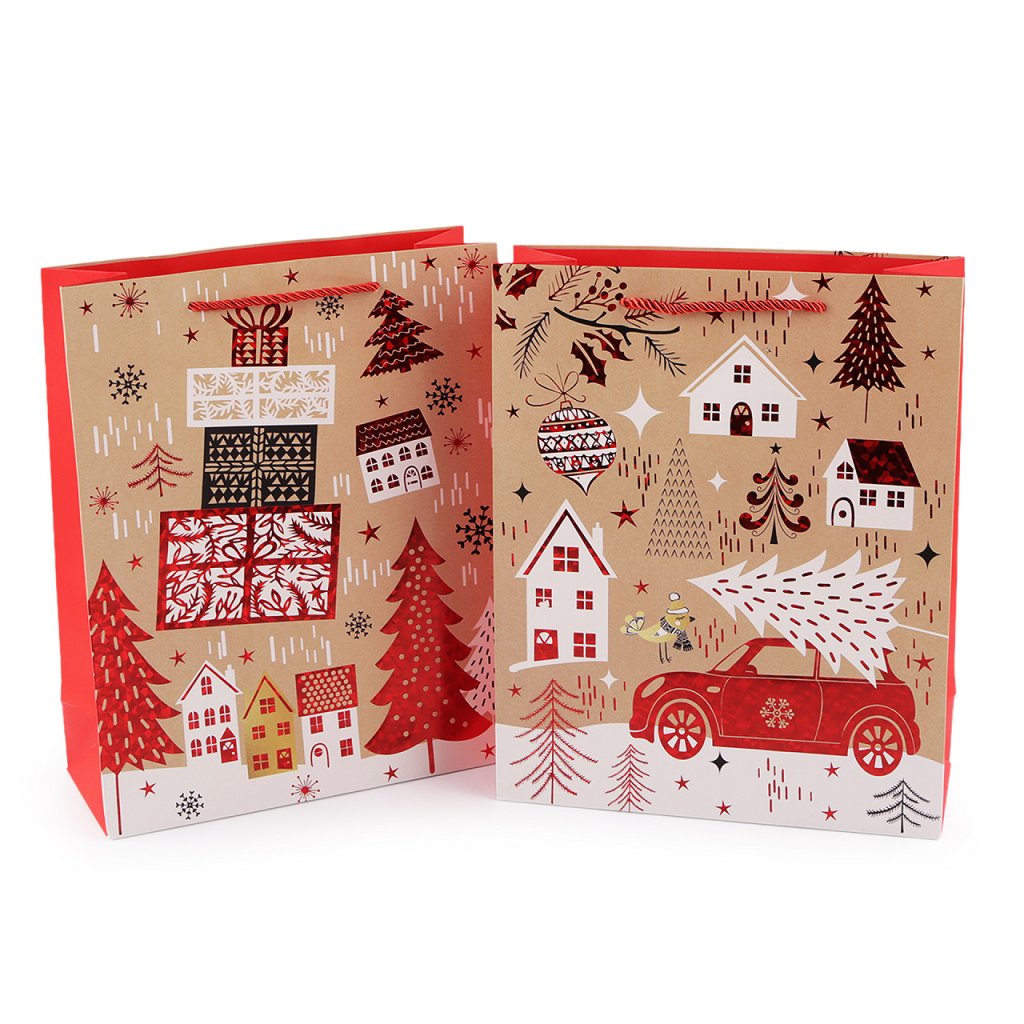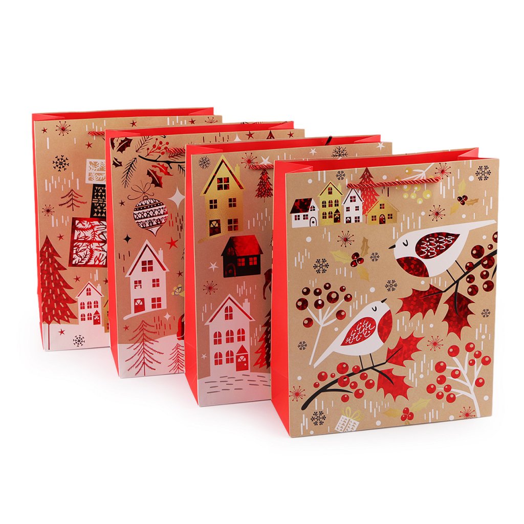 Sada vánočních dárkových tašek je skvělou volbou pro zabalení široké škály vánočních dárků, ať už se jedná o oblečení, knihy, kosmetiku nebo hračky. Ušetří vám spoustu času při balení. Jsou vyrobené z kvalitního pevného křídového papíru. Přední strana je ozdobená potiskem s metalickými detaily, zadní strana má barevný potisk, boky jsou jednobarevné. Ucha tašky jsou z kroucené saténové šňůry.