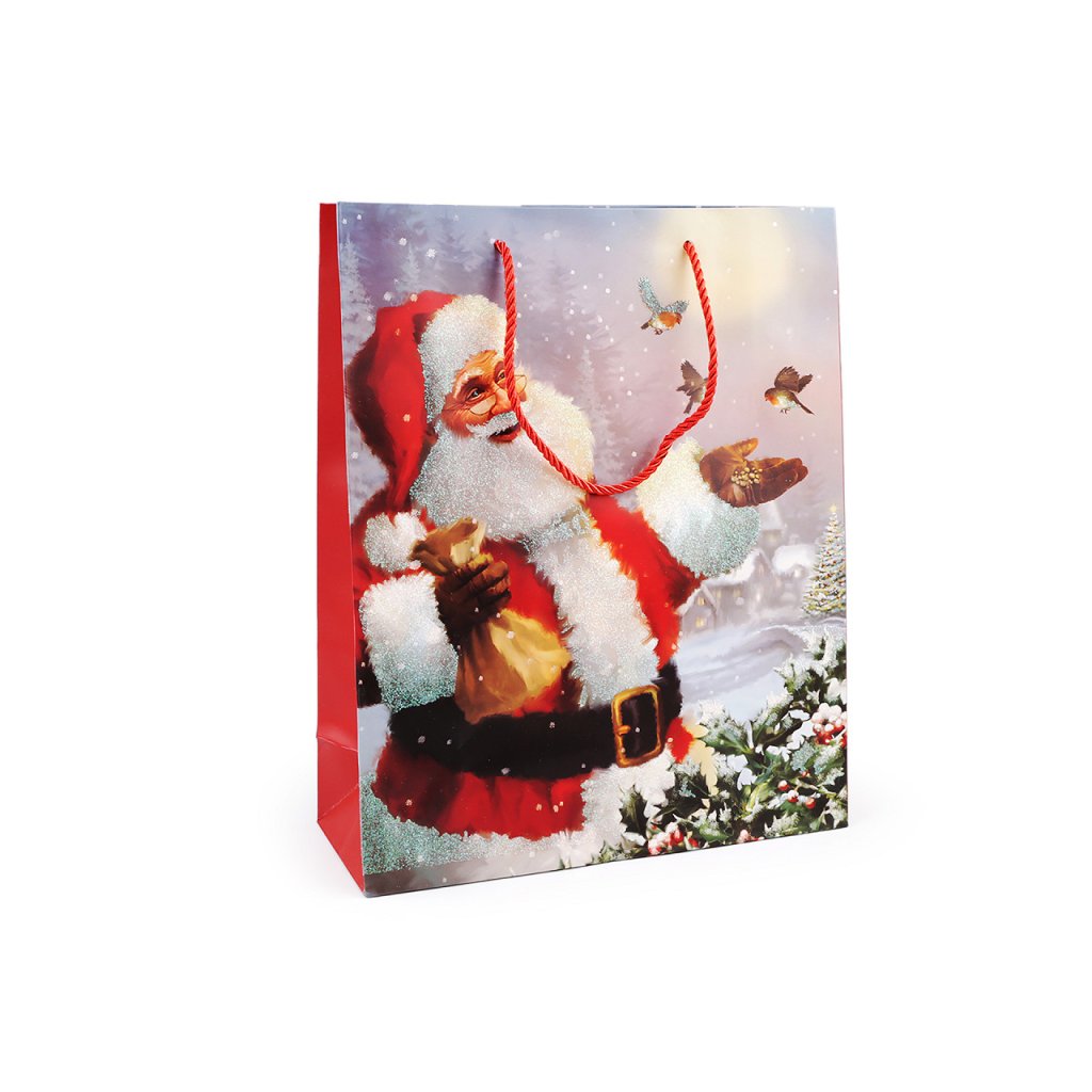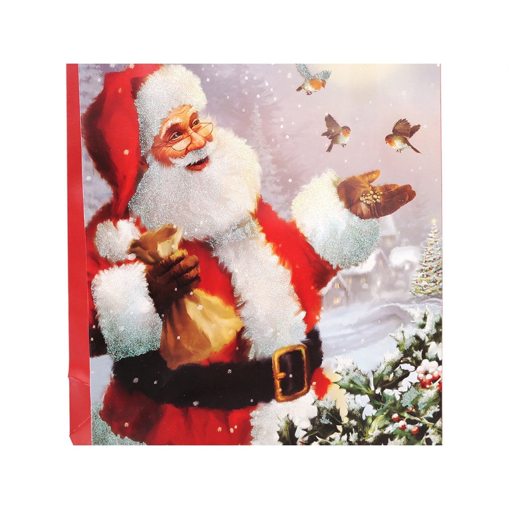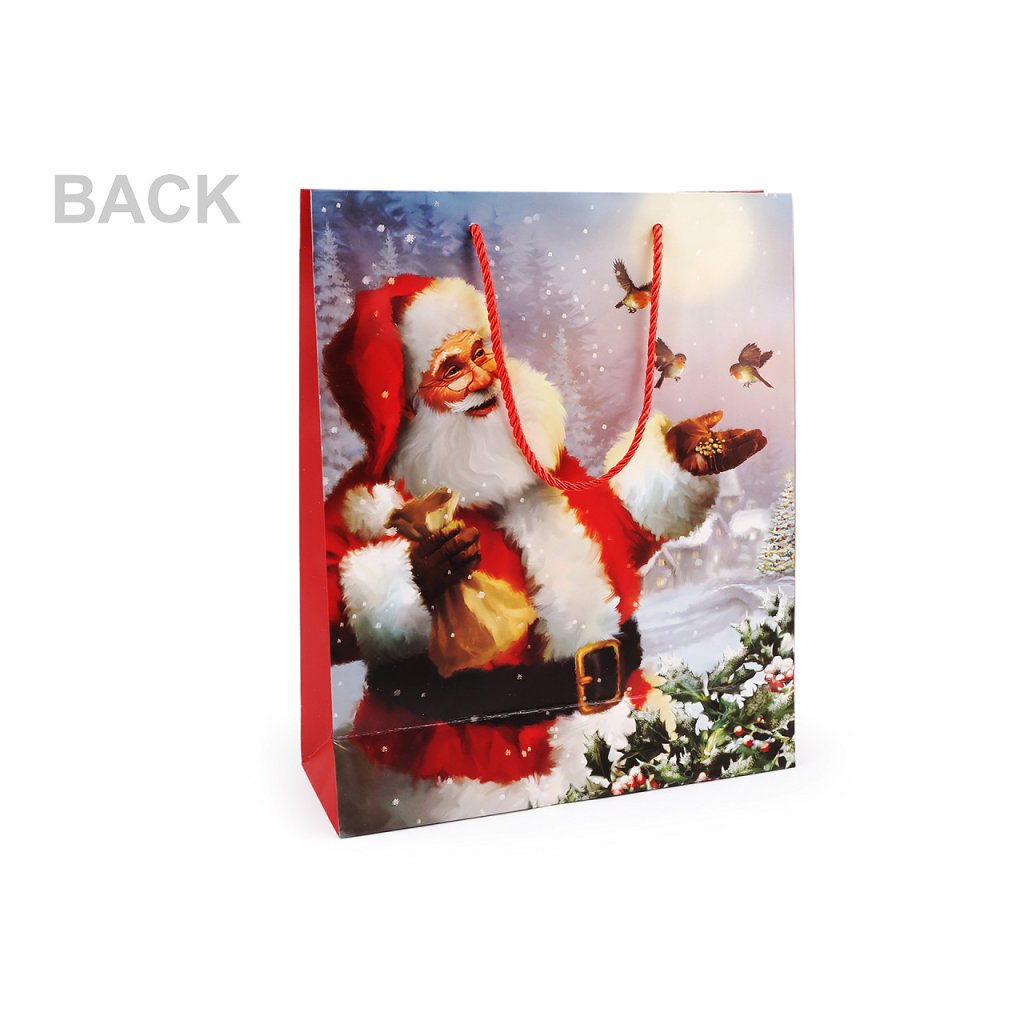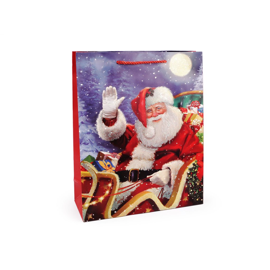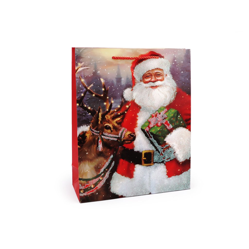 Vánoční dárková taška s motivem Santa Clause je vyrobená z kvalitního pevného křídového papíru. Přední strana tašky je ozdobená glitry. Ucha tašky jsou ze spletené šňůry. Taška vám ušetří čas při balení dárků.