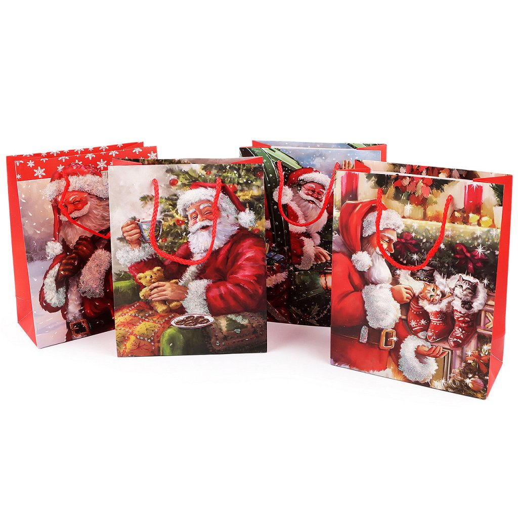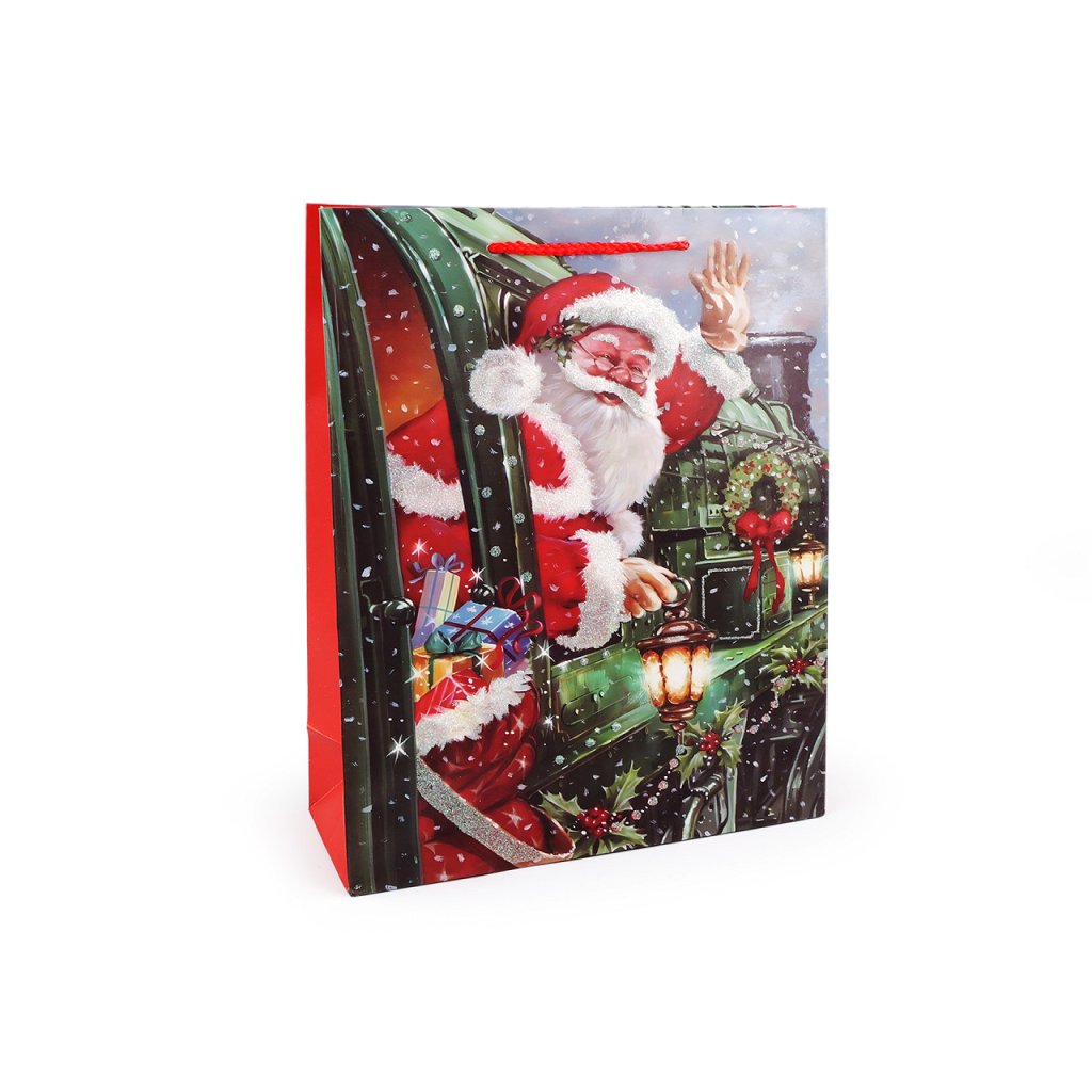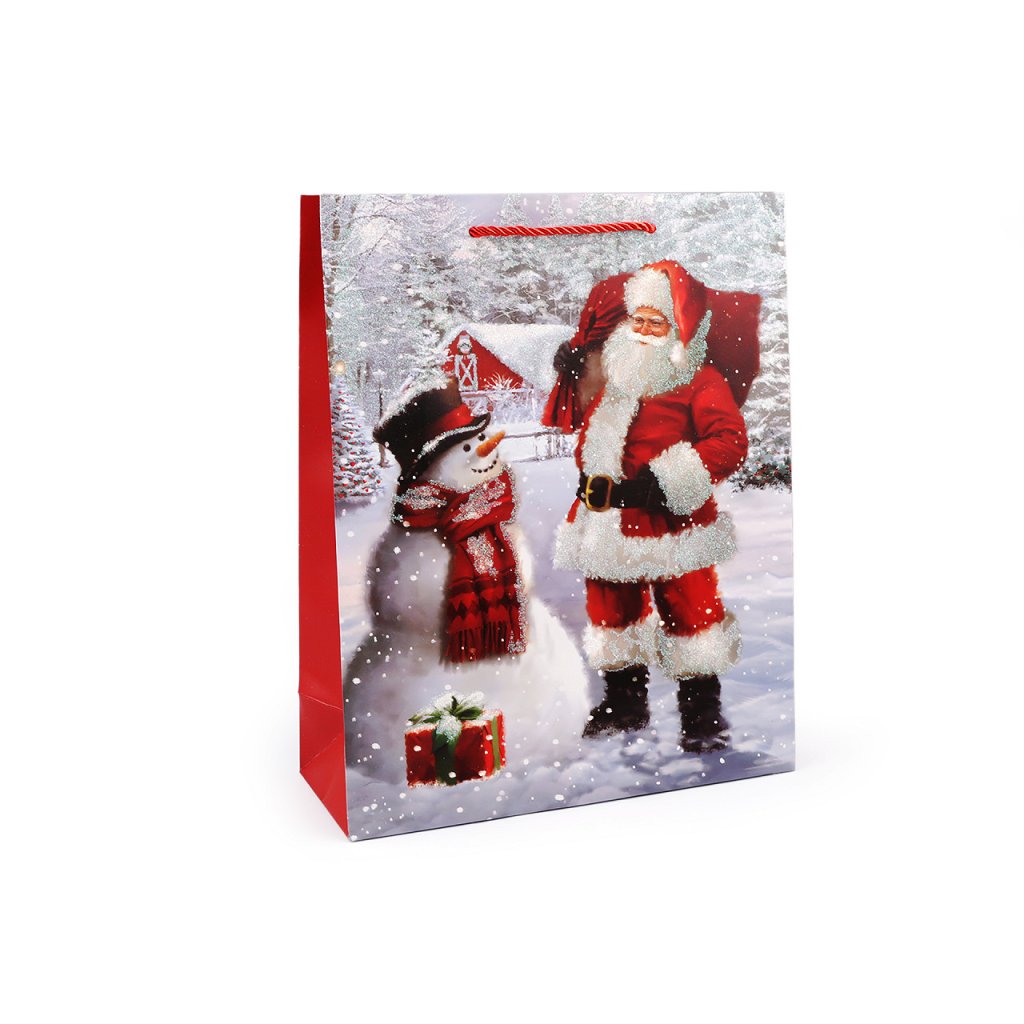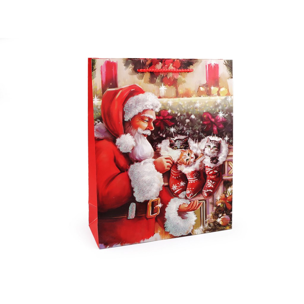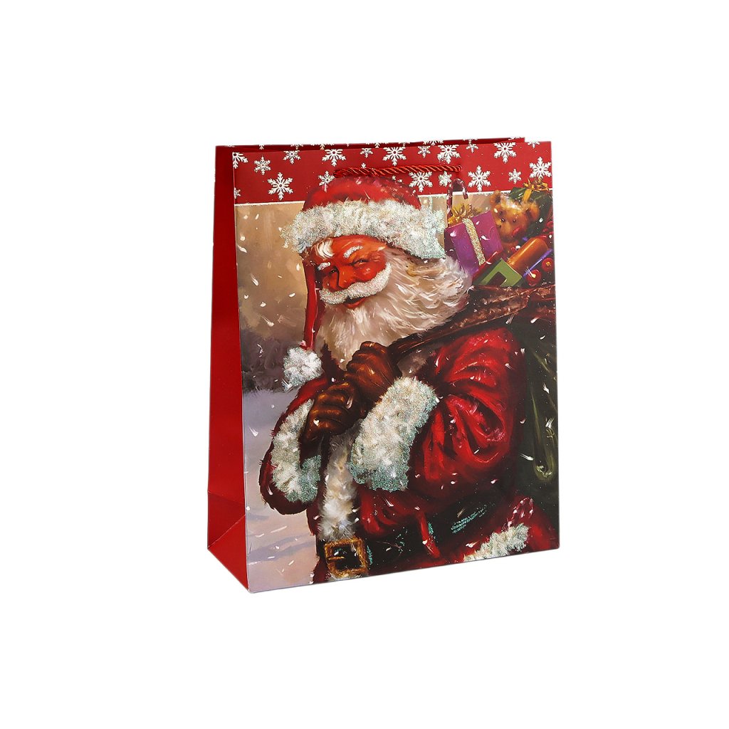 Vánoční dárková taška s motivem Santa Clause je vyrobená z kvalitního pevného křídového papíru. Přední strana tašky je ozdobená glitry. Ucha tašky jsou ze spletené šňůry. Taška vám ušetří čas při balení dárků.