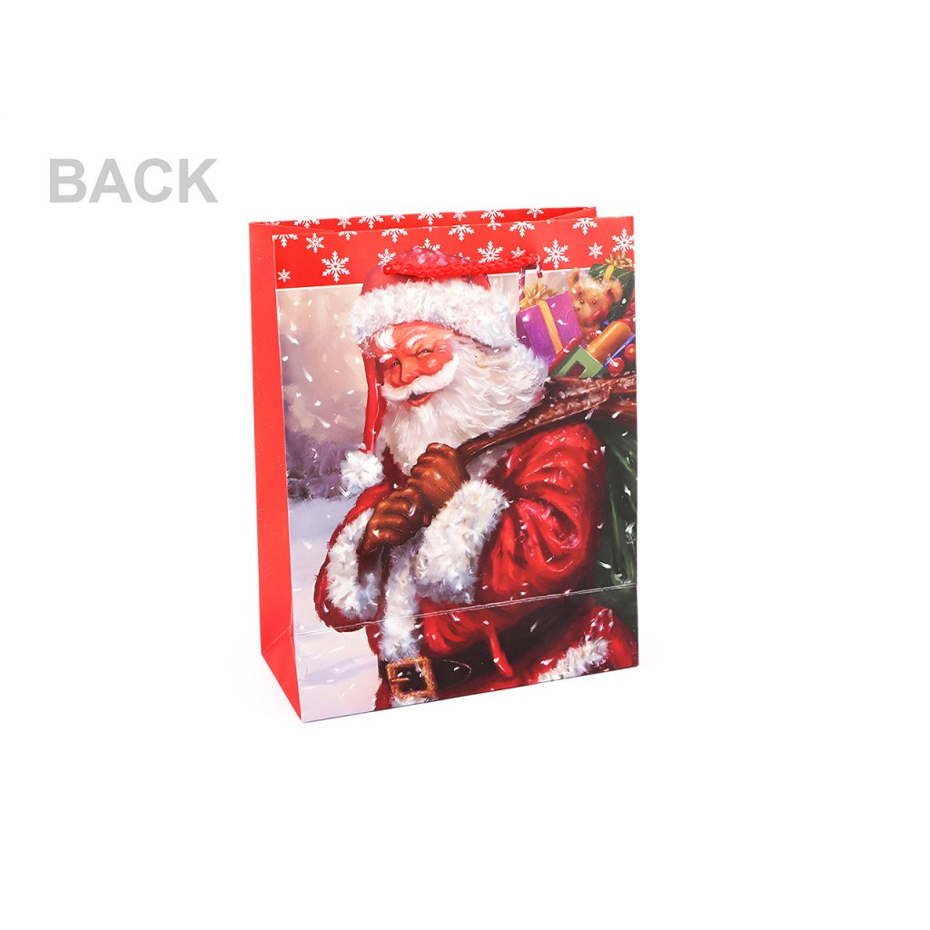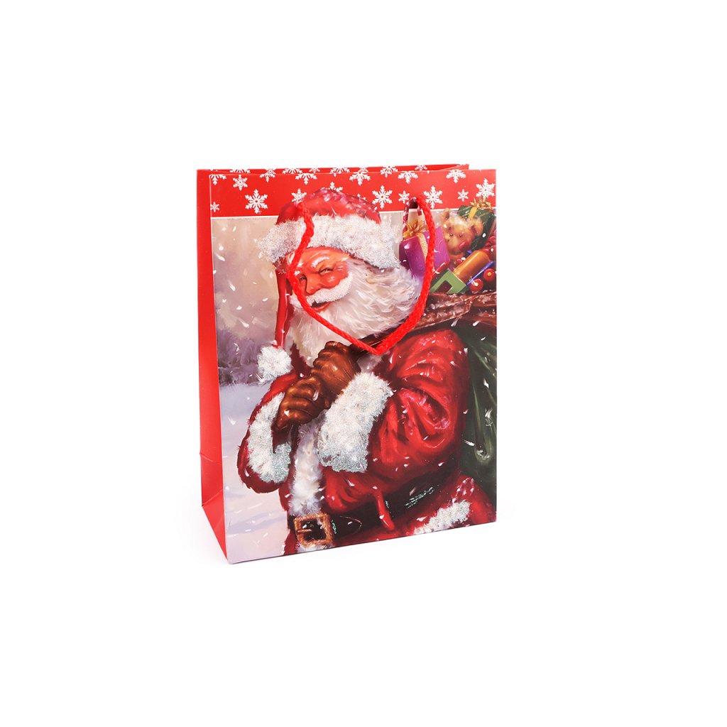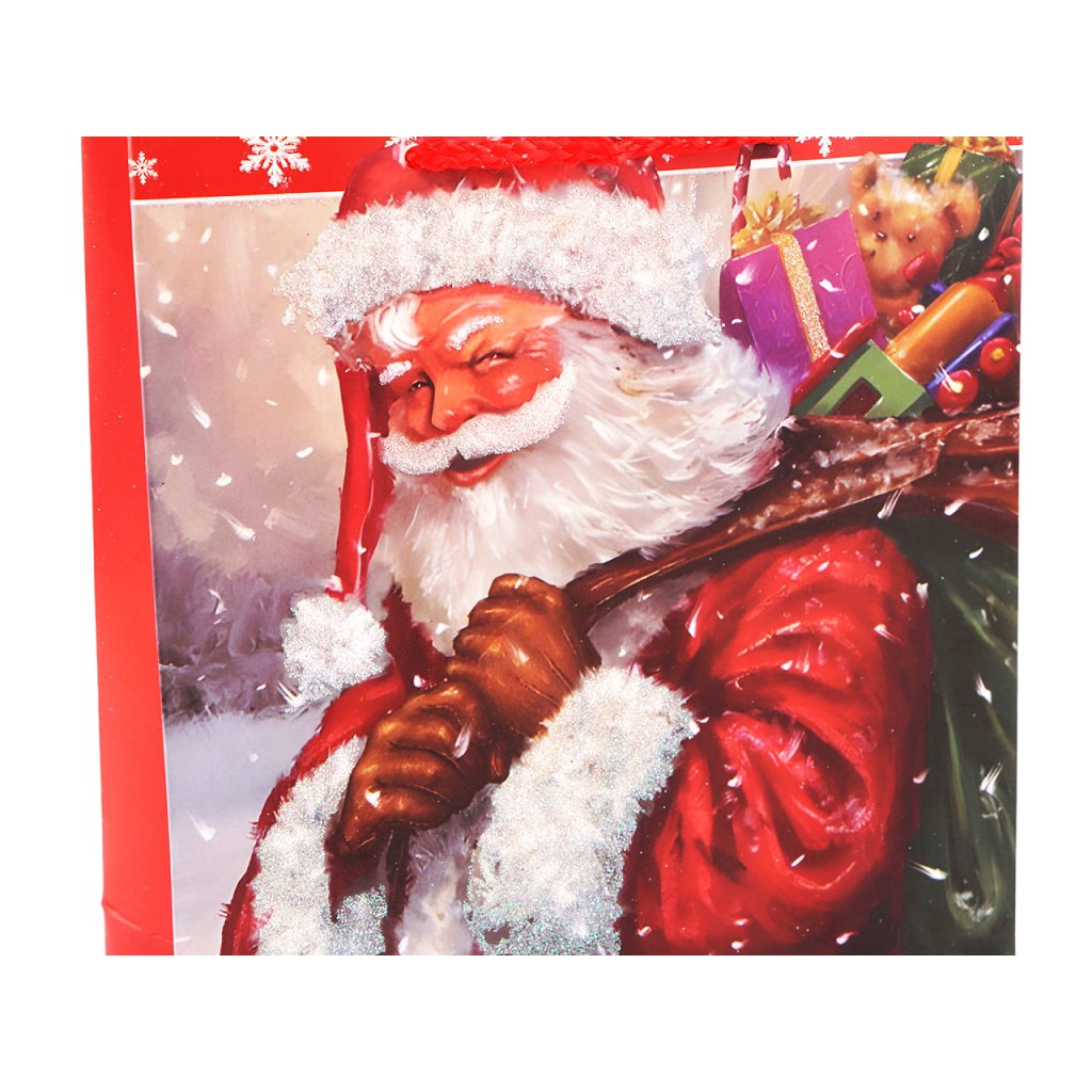 Vánoční dárková taška s motivem Santa Clause s glitry je vyrobená z kvalitního pevného křídového papíru. Přední strana tašky je zdobená motivem s glitry, zadní strana je hladká. Ucha tašky jsou ze spletené šňůry. Taška vám ušetří čas při balení dárků.