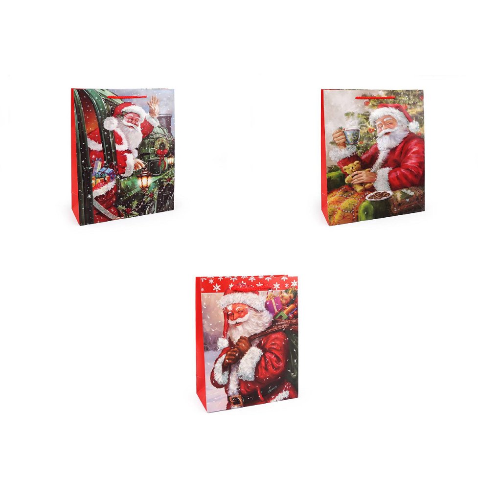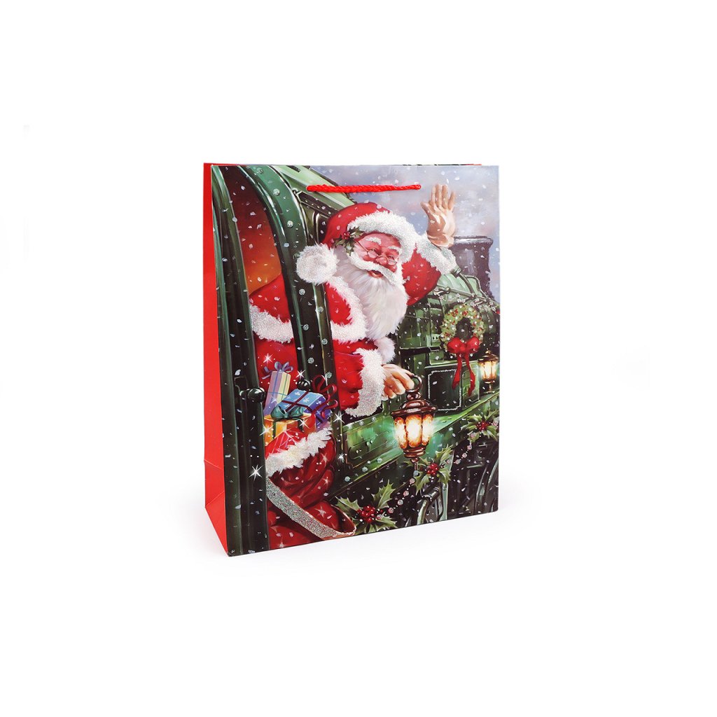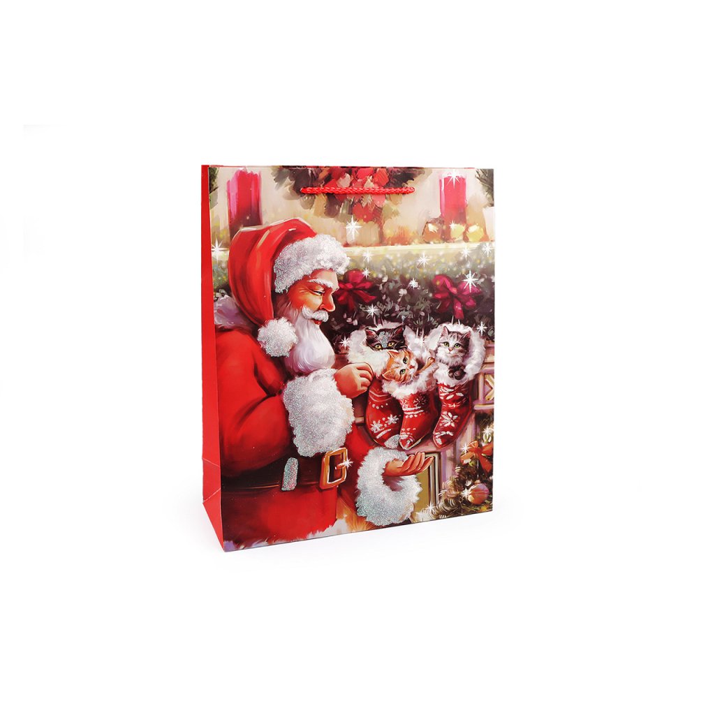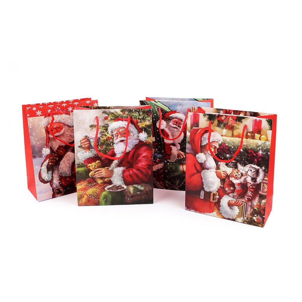 Vánoční dárková taška s motivem Santa Clause s glitry je vyrobená z kvalitního pevného křídového papíru. Přední strana tašky je zdobená motivem s glitry, zadní strana je hladká. Ucha tašky jsou ze spletené šňůry. Taška vám ušetří čas při balení dárků.