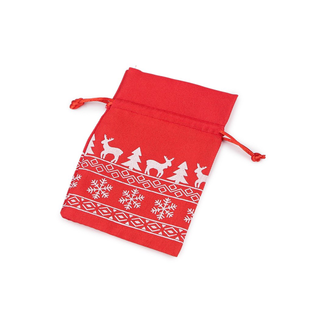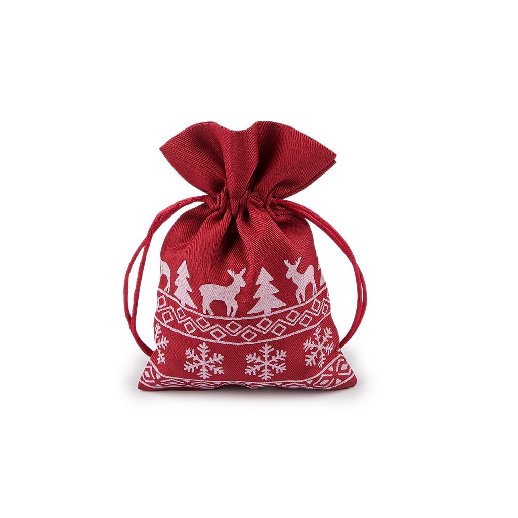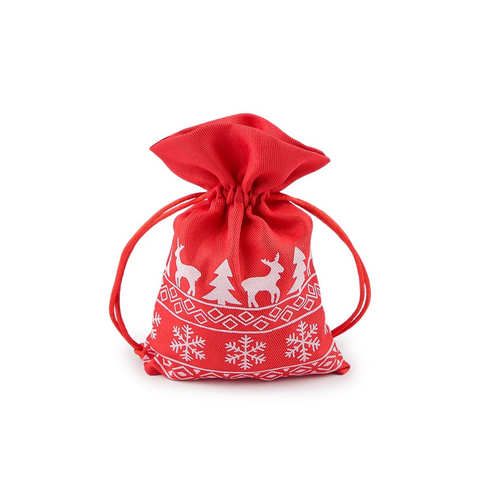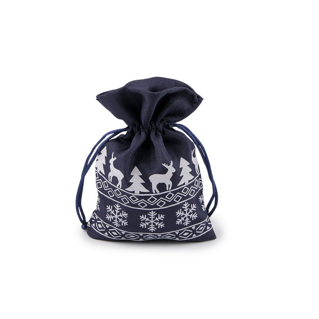 Vánoční dárkový pytlík je z obou stran ozdobený potiskem sobů, stromečků a vloček. Můžete ho použít na dárky nebo ho naplnit mikulášskou nadílkou, ušetří vám čas při balení. Dá se naaranžovat i jako vánoční dekorace. Stahuje se pomocí kulatých saténových šňůrek, dárku dodá osobní kouzlo a půvab.
