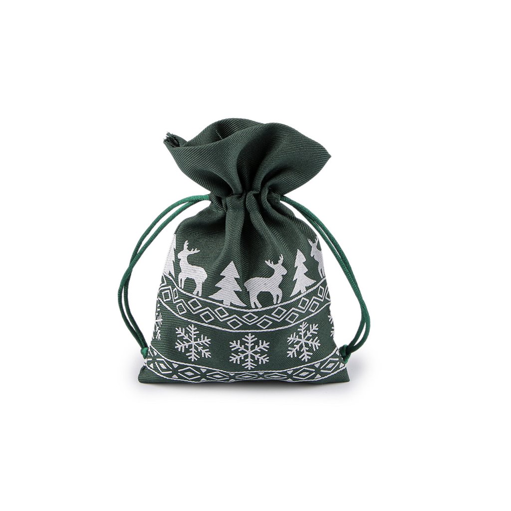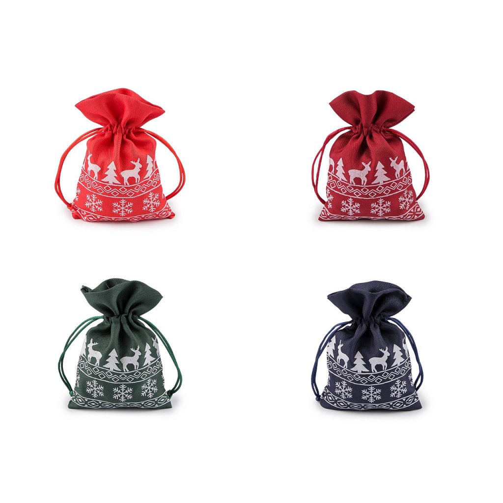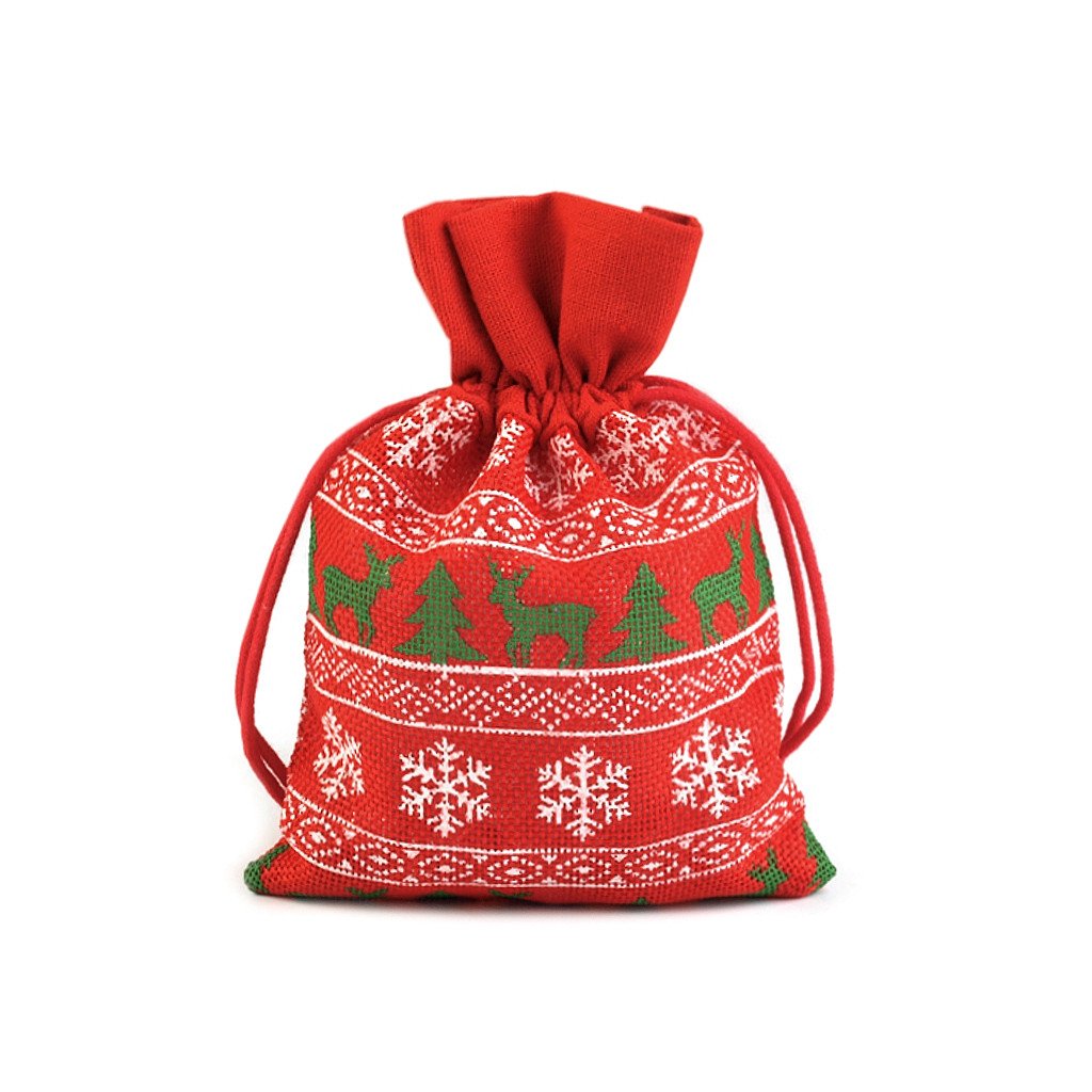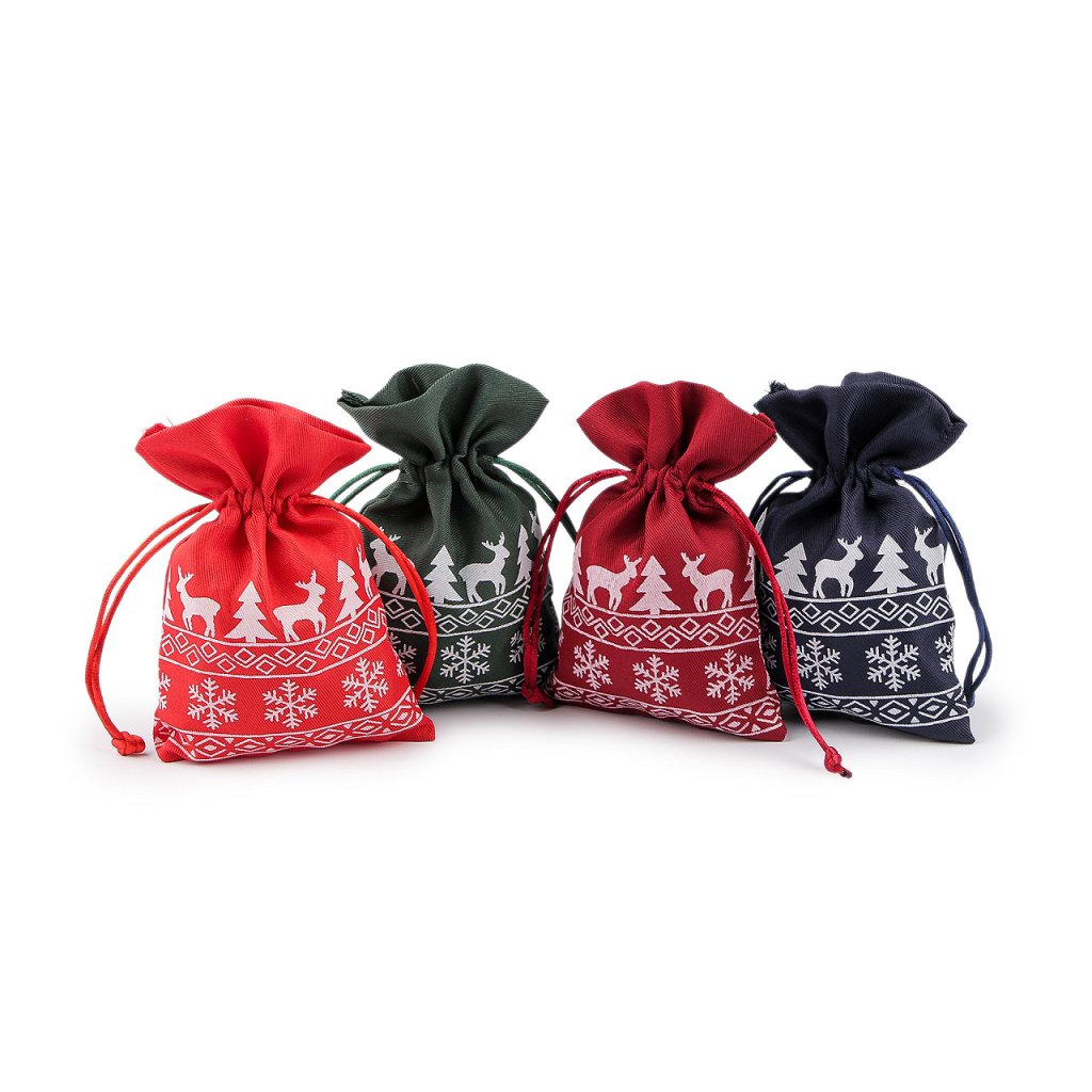 Vánoční dárkový pytlík je z obou stran ozdobený potiskem sobů, stromečků a vloček. Můžete ho použít na dárky nebo ho naplnit mikulášskou nadílkou, ušetří vám čas při balení. Dá se naaranžovat i jako vánoční dekorace. Stahuje se pomocí kulatých saténových šňůrek, dárku dodá osobní kouzlo a půvab.