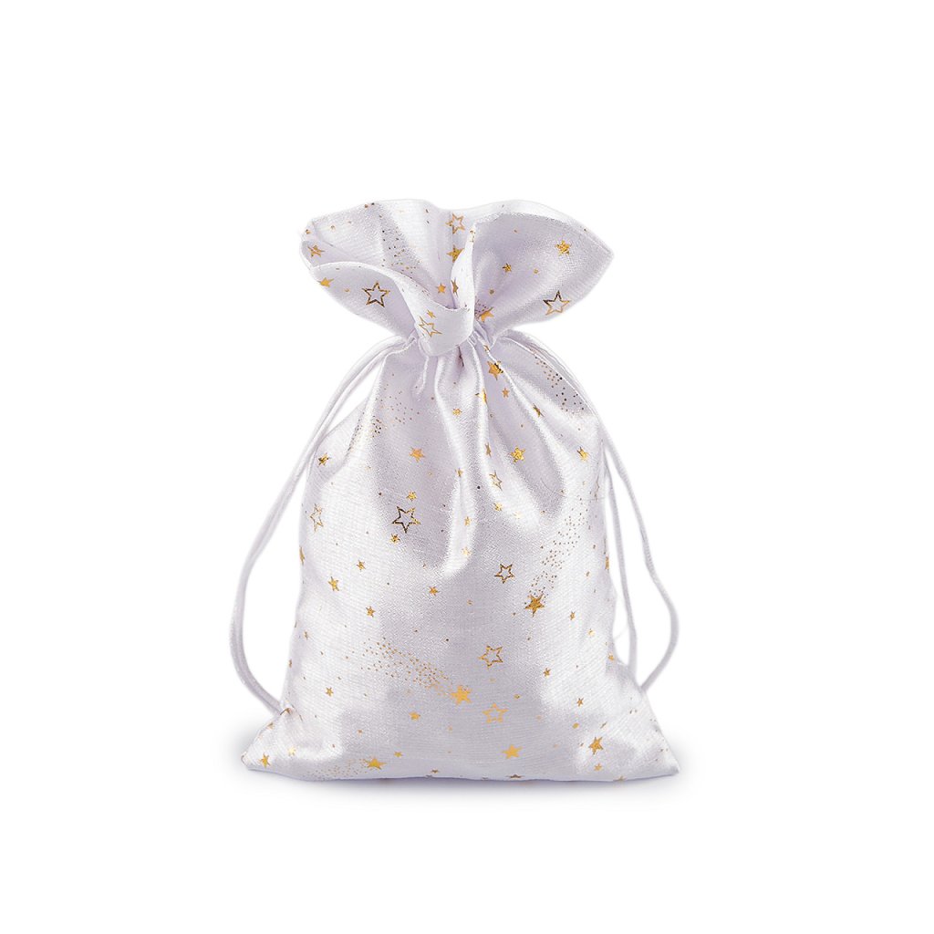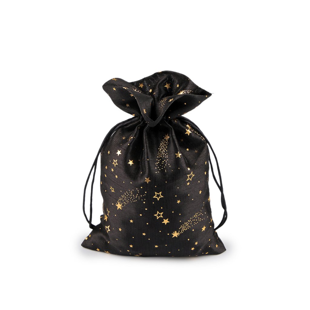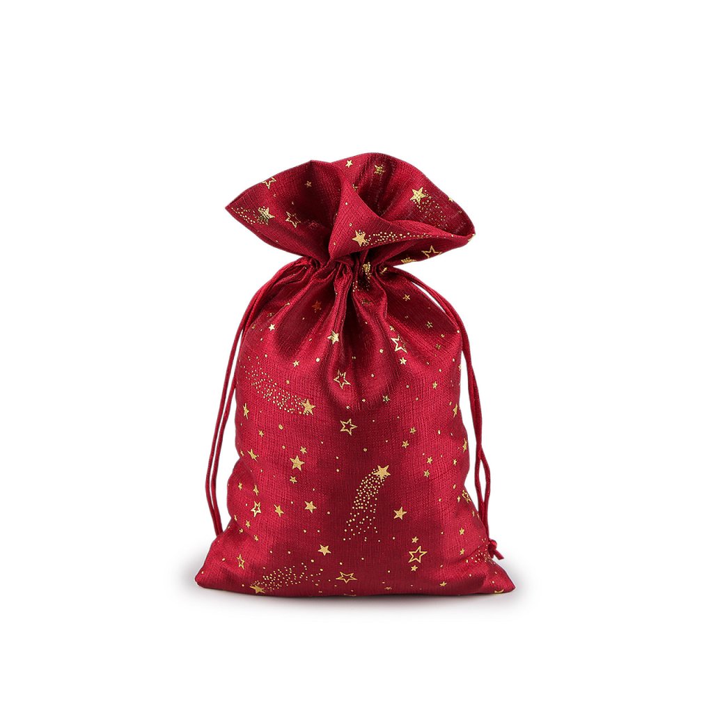 Vánoční dárkový pytlík je na obou stranách ozdobený potiskem zlatých metalických hvězdiček. Působí elegantně a luxusně, můžete ho použít na dárky nebo ho naplnit mikulášskou nadílkou, ušetří vám čas při balení. Dá se naaranžovat i jako vánoční dekorace. Stahuje se pomocí kulatých saténových šňůrek, dárku dodá osobní kouzlo a půvab.
