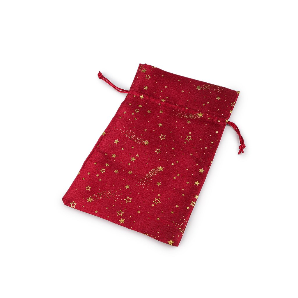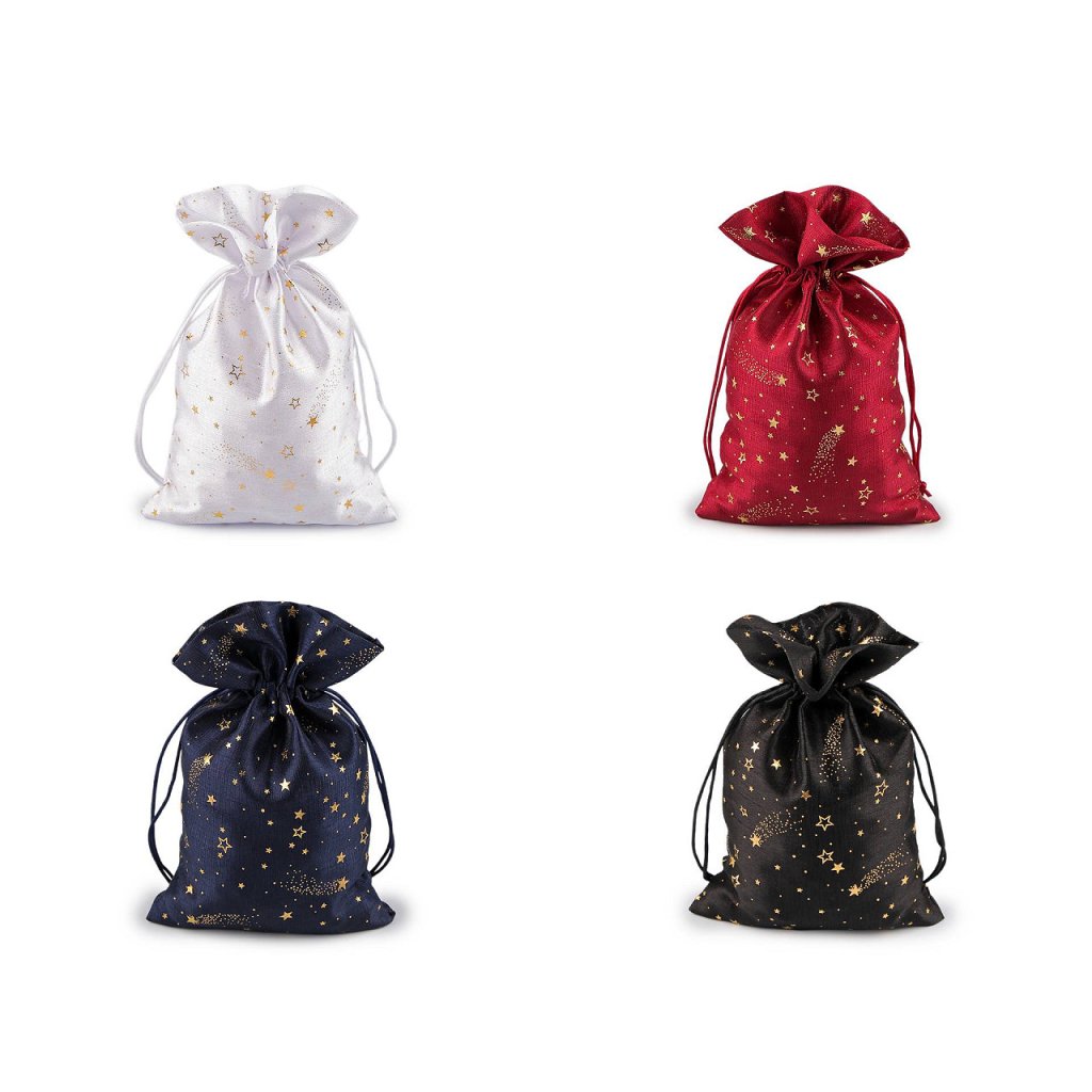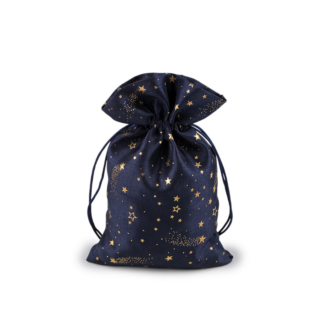Vánoční dárkový pytlík je na obou stranách ozdobený potiskem zlatých metalických hvězdiček. Působí elegantně a luxusně, můžete ho použít na dárky nebo ho naplnit mikulášskou nadílkou, ušetří vám čas při balení. Dá se naaranžovat i jako vánoční dekorace. Stahuje se pomocí kulatých saténových šňůrek, dárku dodá osobní kouzlo a půvab.