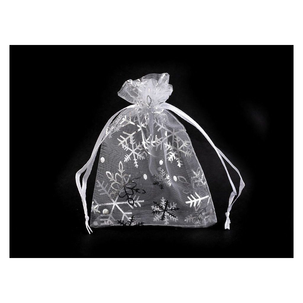 Dárkový pytlíček je vyrobený z organzy a zdobí ho sněhové vločky. Snadno se uzavírá pomocí dvou stahovacích šňůrek.
