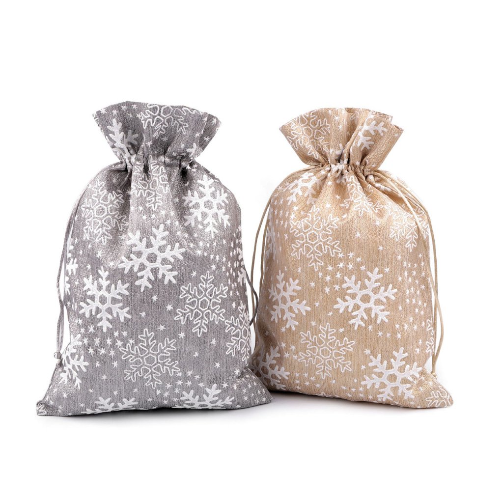 Pytlík s potiskem vloček je ideální dekorací na Vánoce. Stahuje se pomocí saténových šňůrek. Je to skvělý způsob, jak krásně zabalit a předat své vánoční dárky. Můžete ho také naplnit mikulášskou nadílkou.