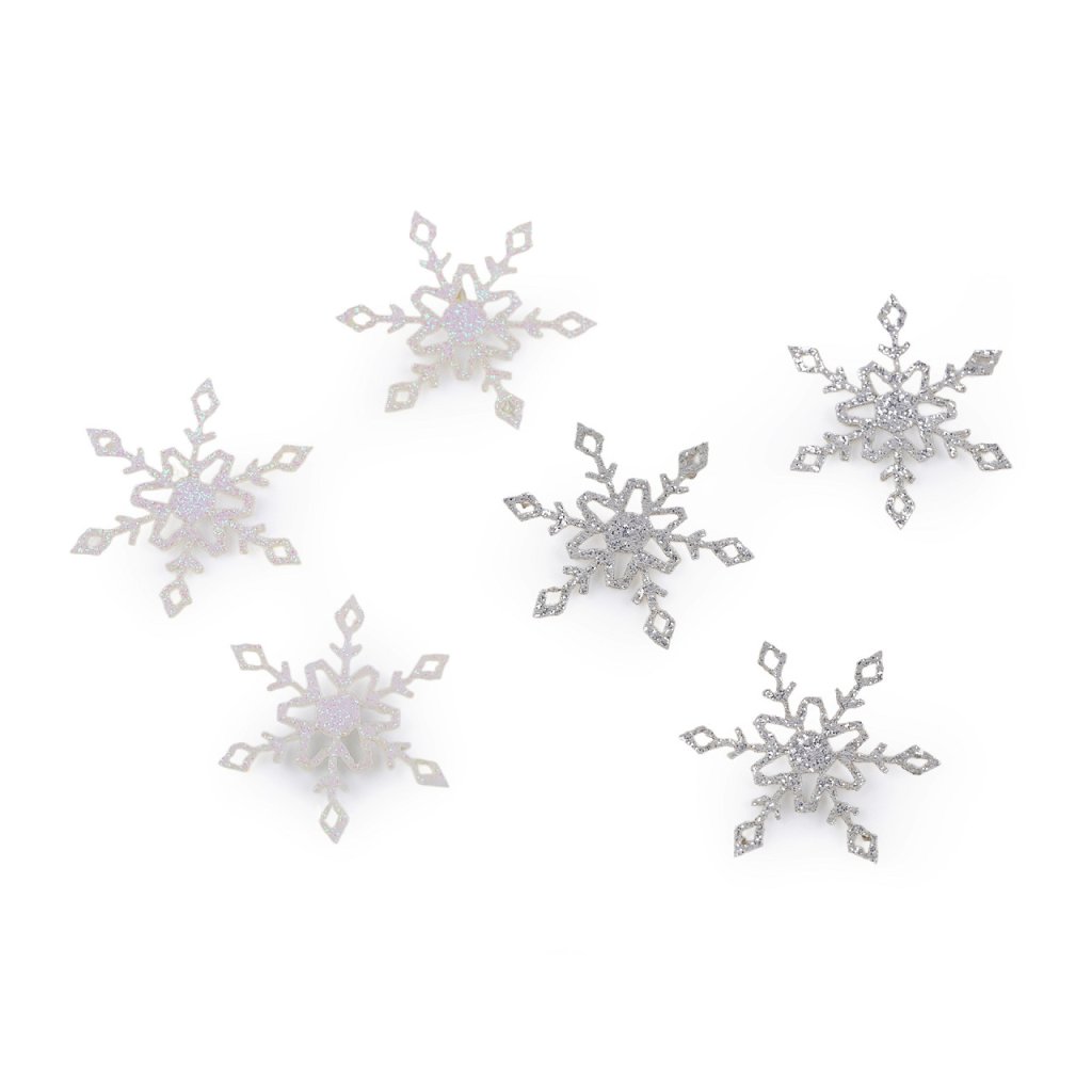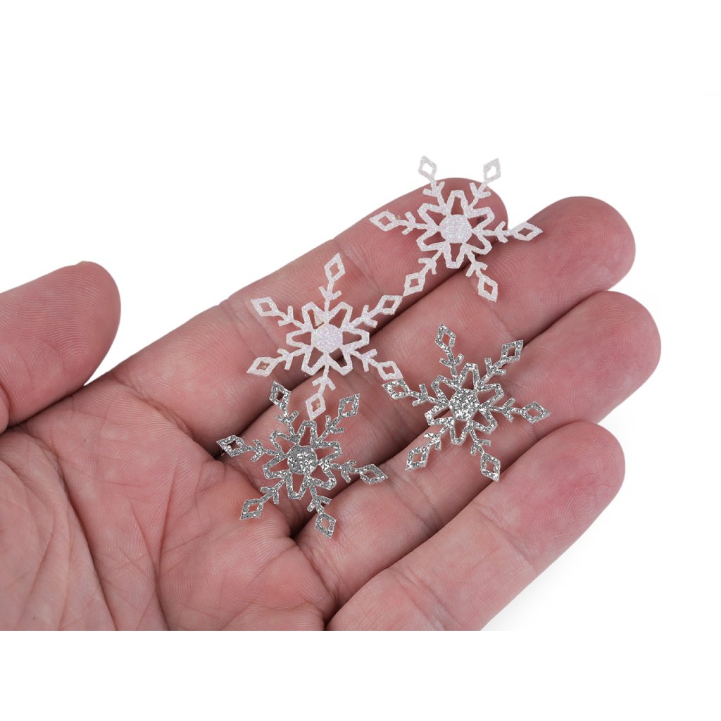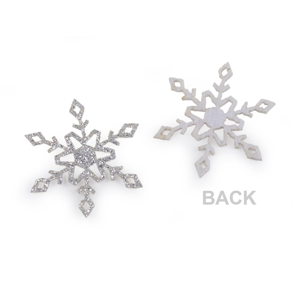 Filcové vločky zdobí z jedné strany třpytivé glitry. Můžete s nimi ozdobit adventní věnce, jmenovky na slavnostní tabuli, přáníčka a různé vánoční dekorace.