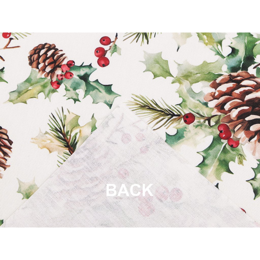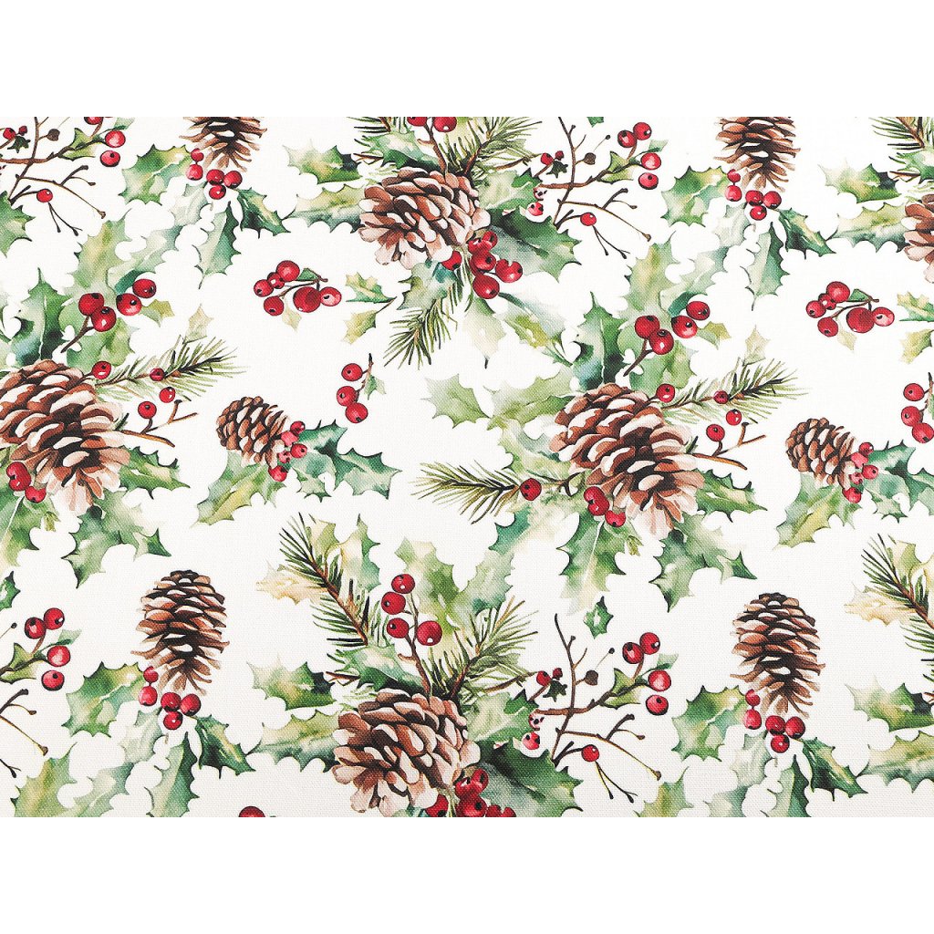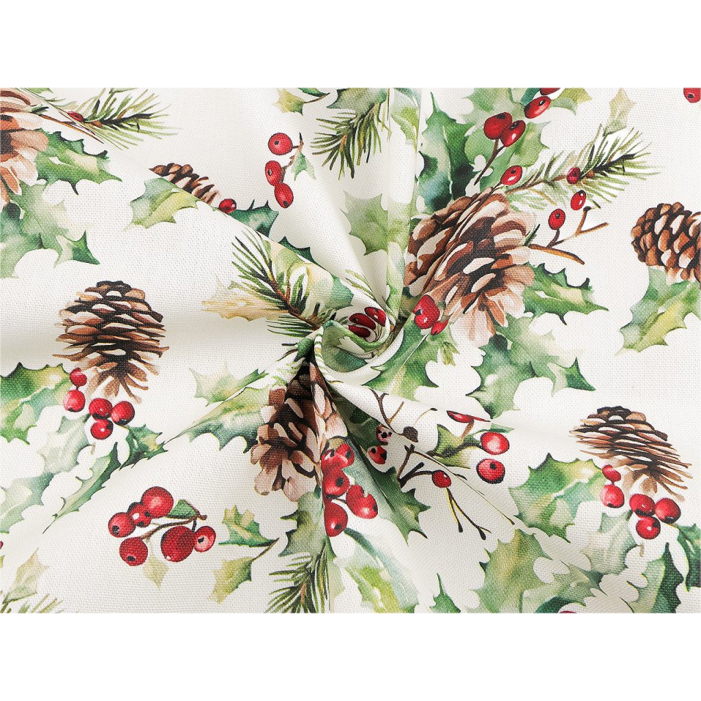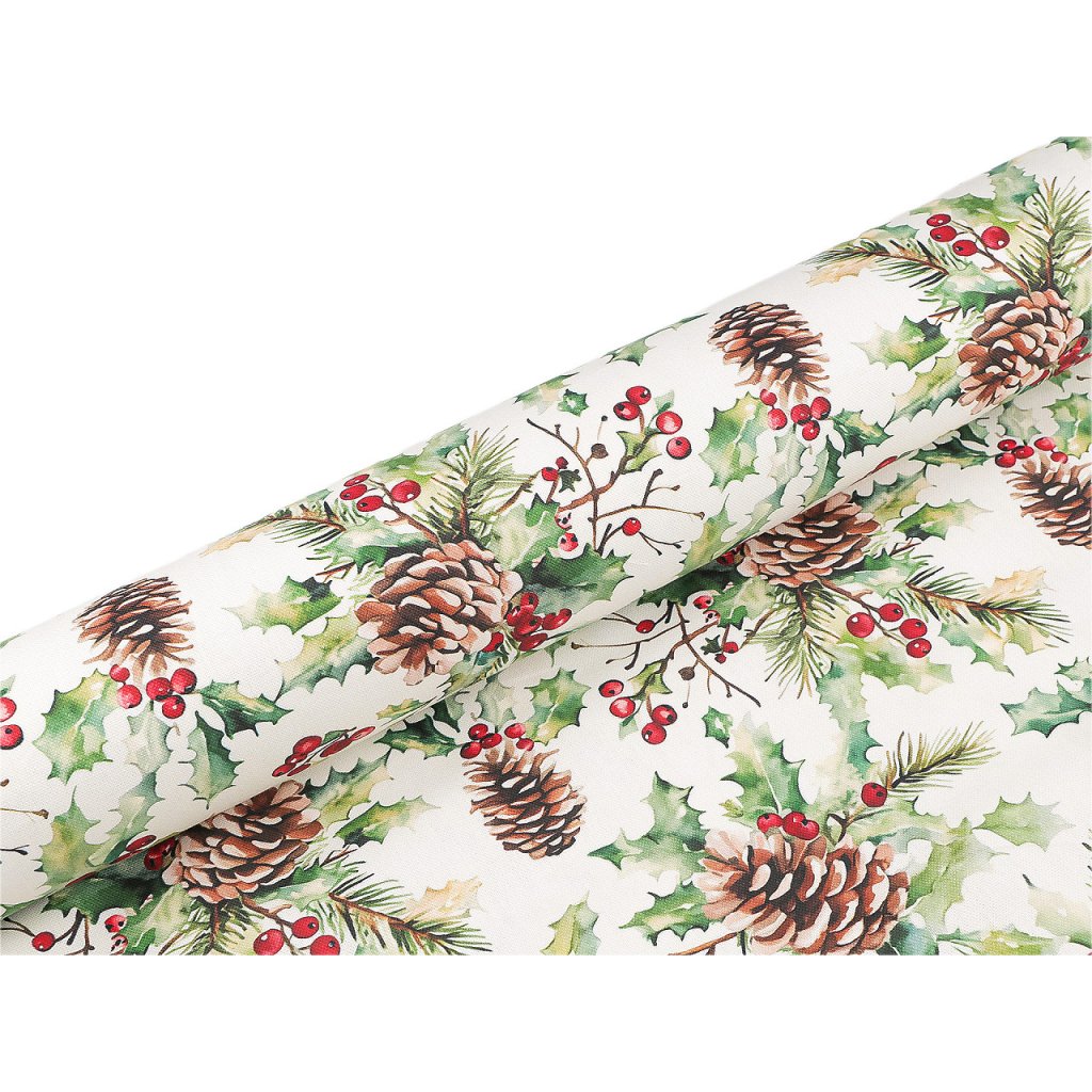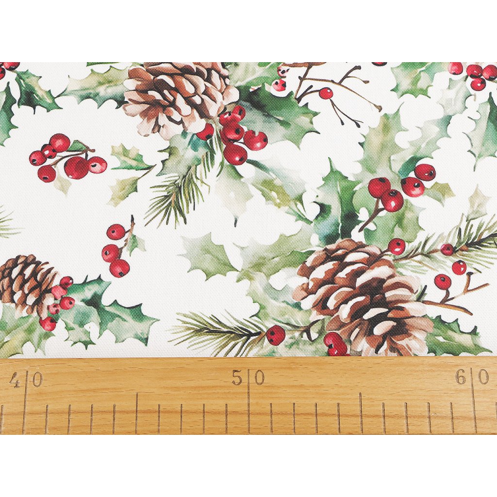 Látka Half panama má strukturu podobnou klasické vyšívací panamě. Je pevná, ale zároveň měkká a příjemná na dotek. Zdobí ji vánoční motiv s cesmínou a šiškami.