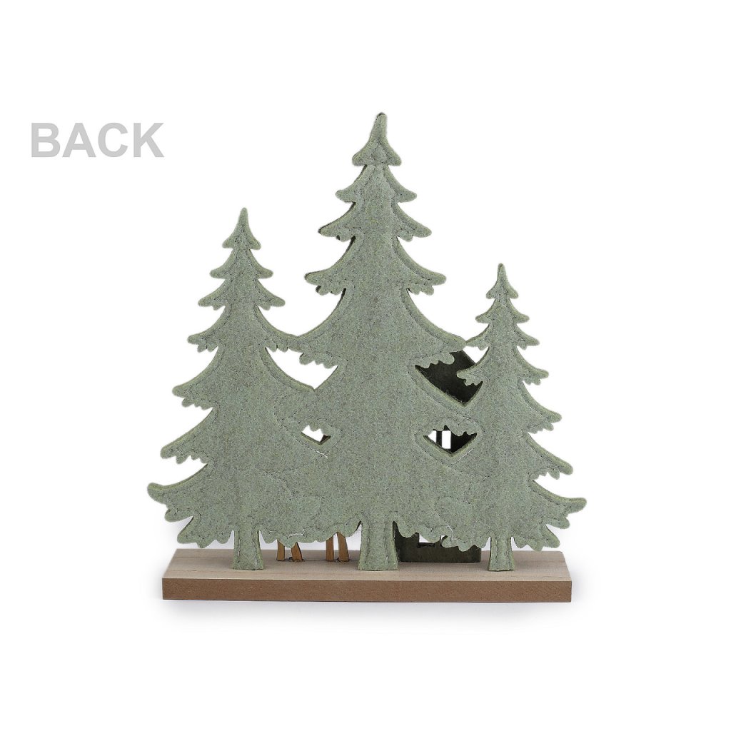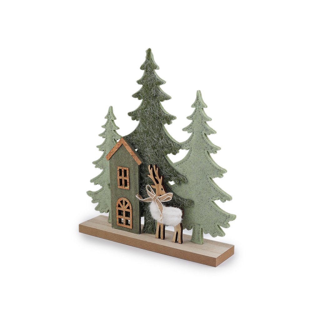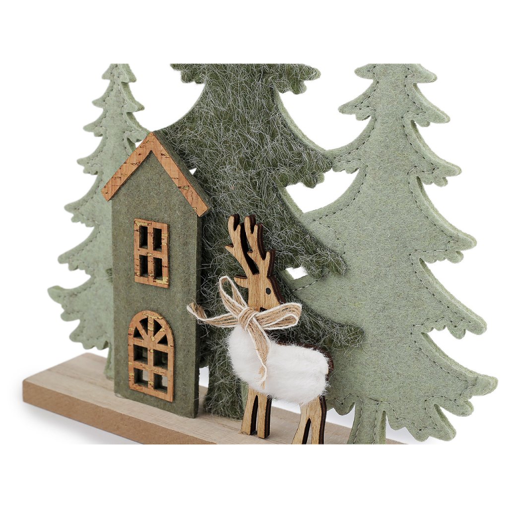 Dekorační les má základ z pevného filcu, podstavec a drobné detaily jsou ze dřeva a korku. Dekorace zútulní každý interiér. Vynikne na okenním parapetu, krbové římse, poličce i na sváteční tabuli.