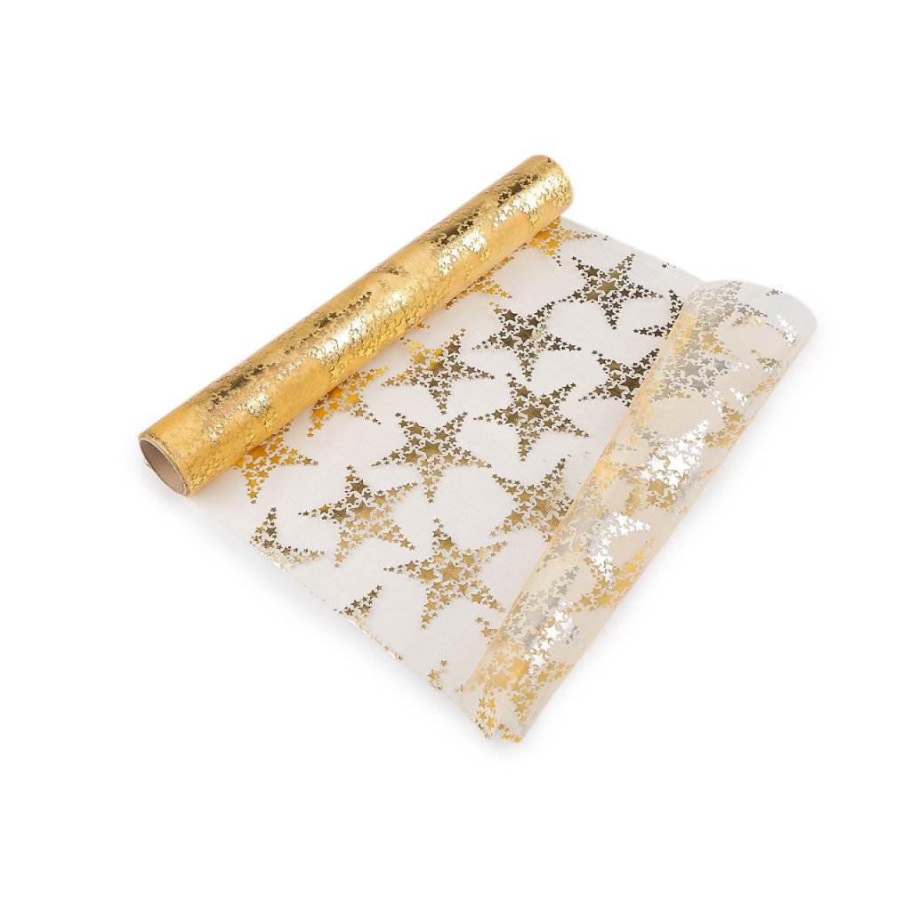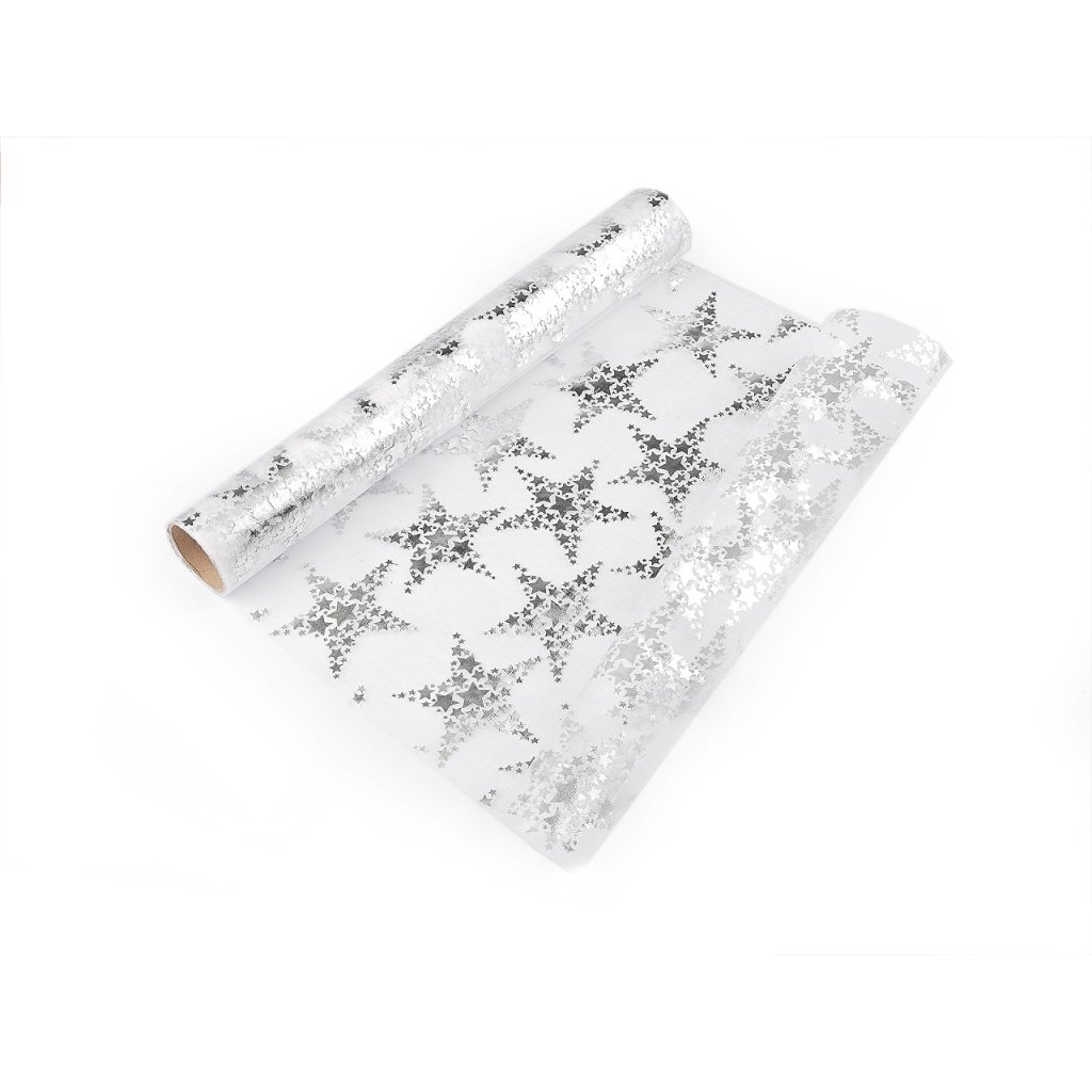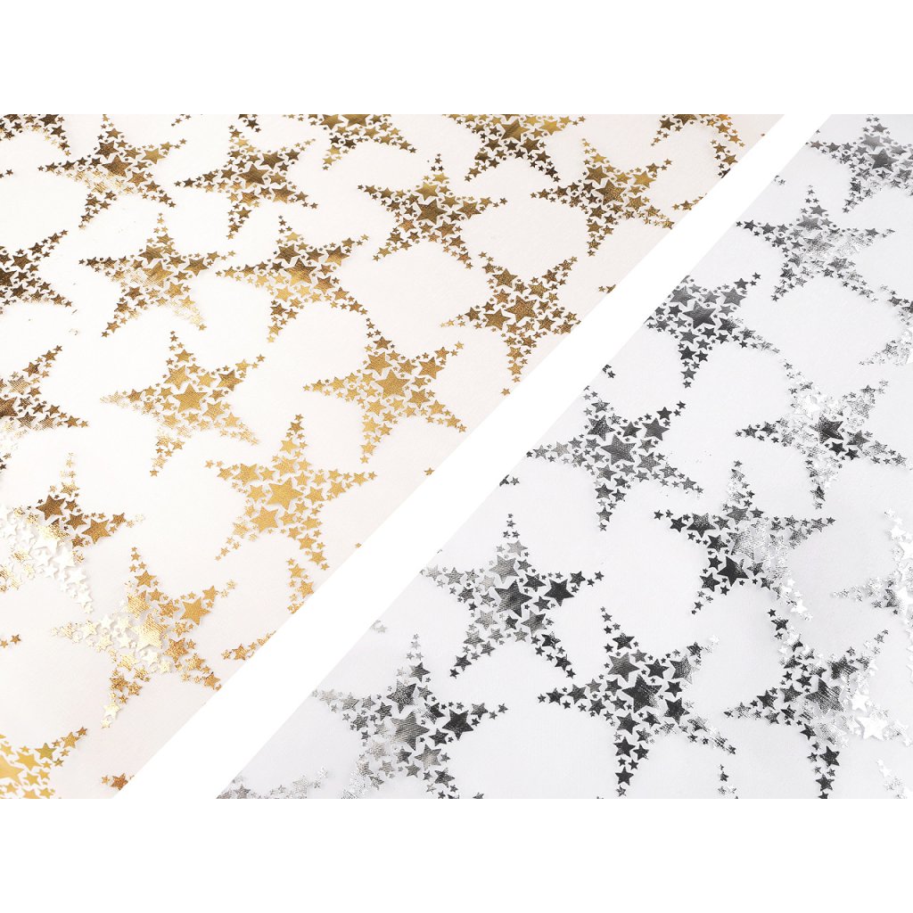 Dekorační organza působí jemně a zároveň elegantně. Zdobí ji metalický potisk hvězd, který je jednostranný. Hodí se ke slavnostním příležitostem.