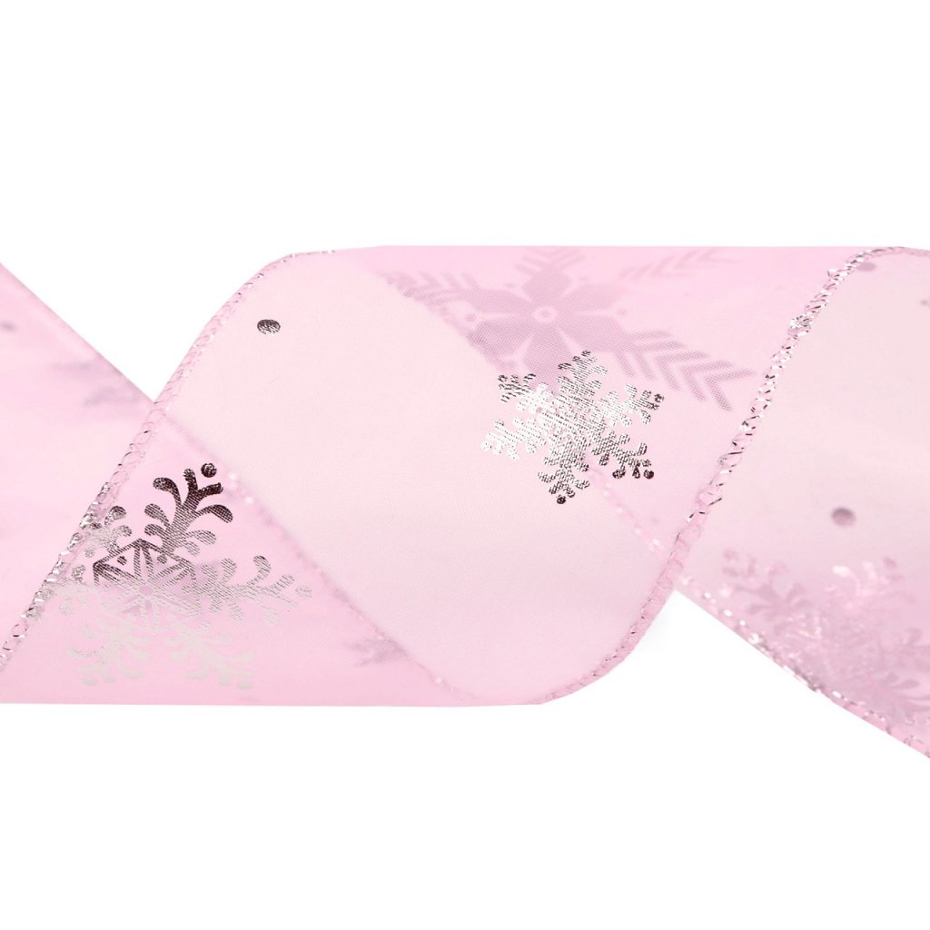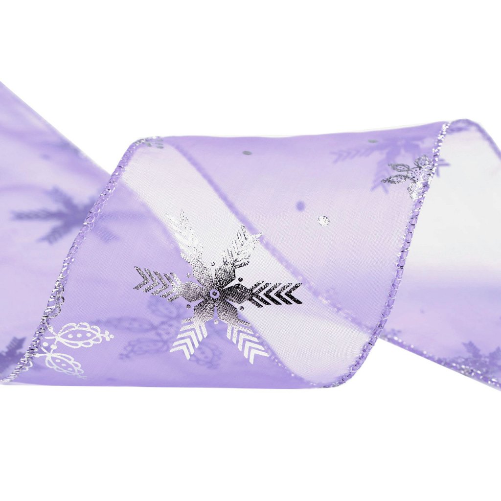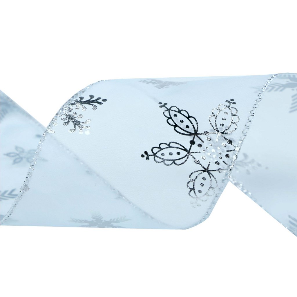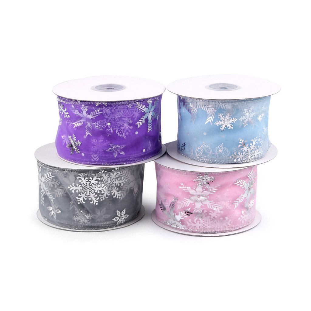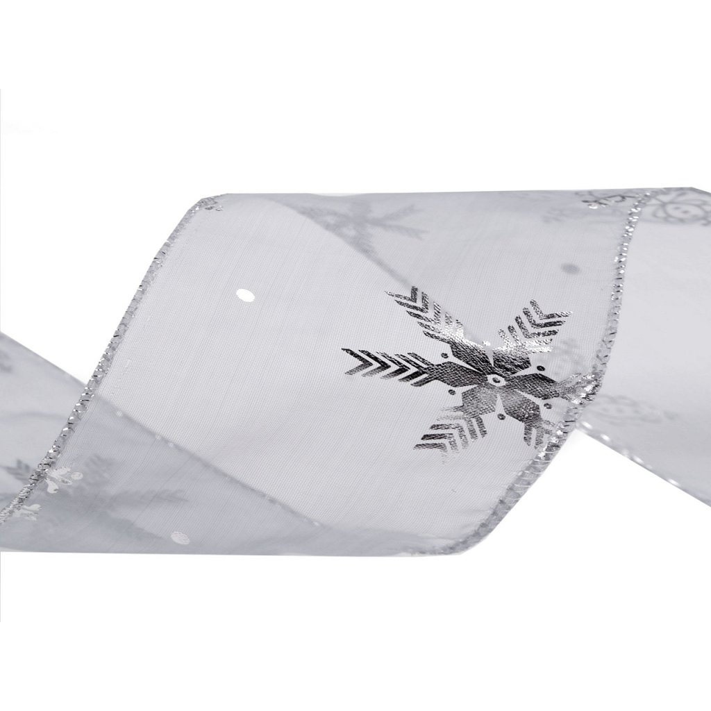 Široká organzová stuha je po stranách obšitá třpytivým lurexem se silonem. Je průsvitná, ozdobená metalickým potiskem sněhových vloček. Potisk je jednostranný, působivě se leskne.