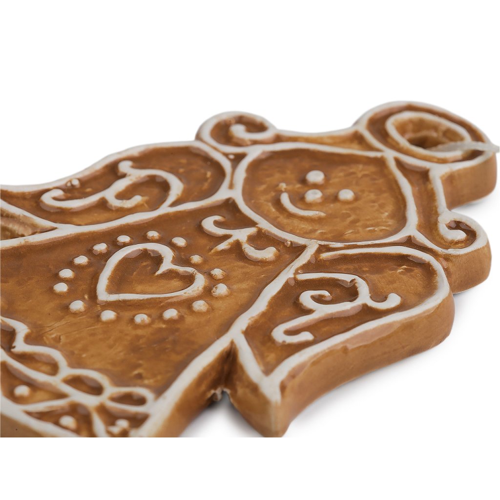Dekorační perníček v podobě andělíčka vyniká bílým dekorem a hravými detaily. Je jednostranně zdobený. Díky poutku ho můžete pověsit na vánoční stromeček, věnce nebo na zeď.