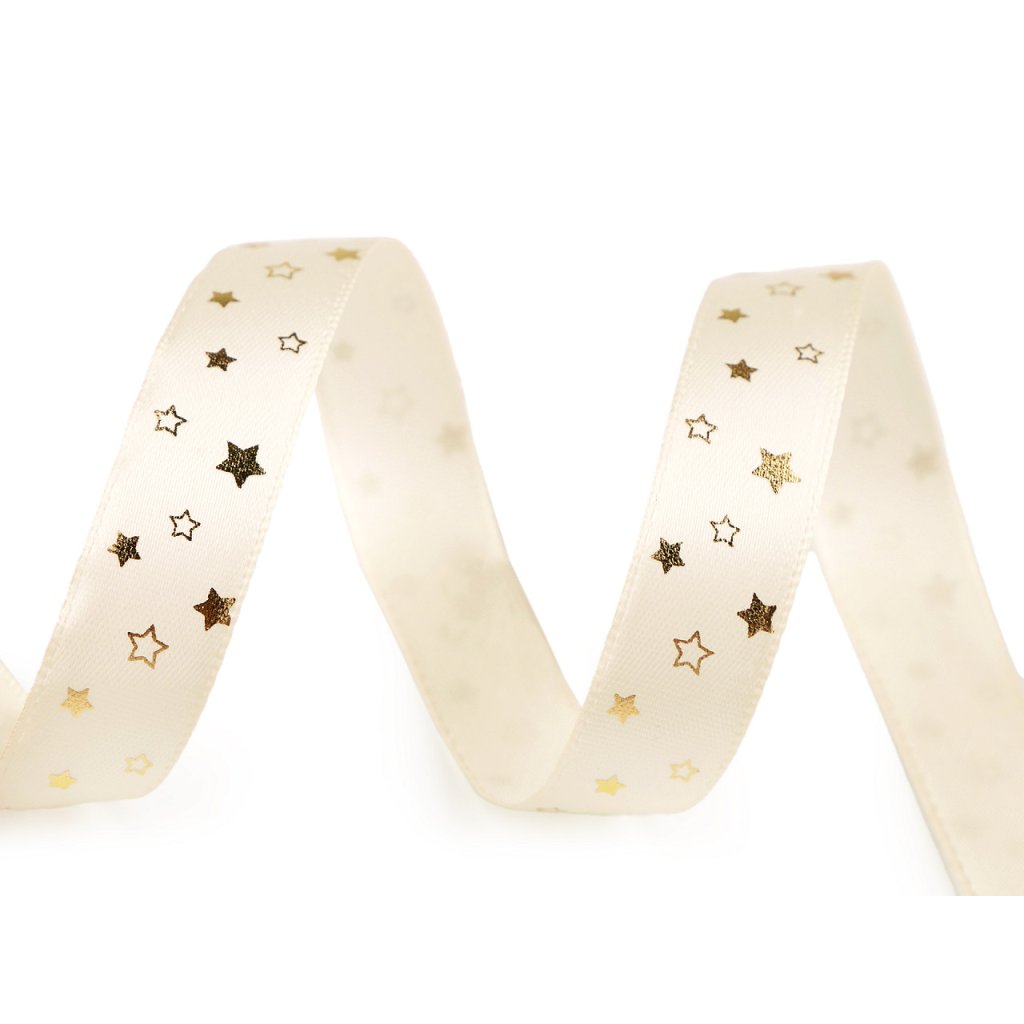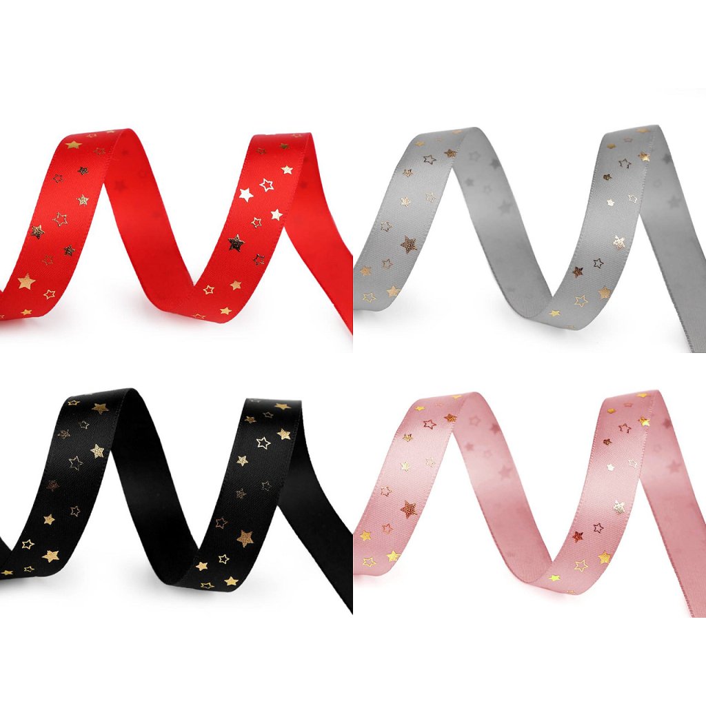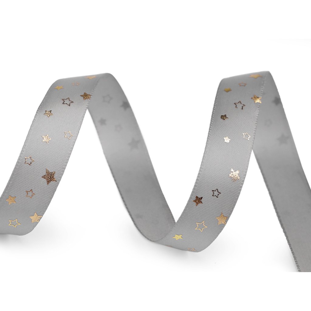 Dekorační saténová stuha s potiskem hvězdiček je velice poutavá. Potisk je jednostranný, metalický, připomíná lurex.