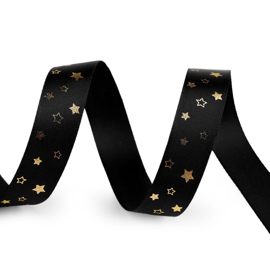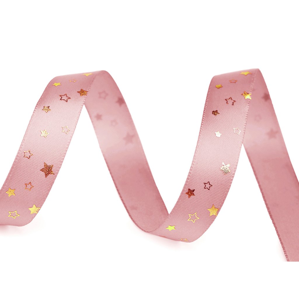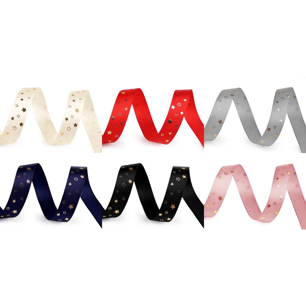 Dekorační saténová stuha s potiskem hvězdiček je velice poutavá. Potisk je jednostranný, metalický, připomíná lurex.