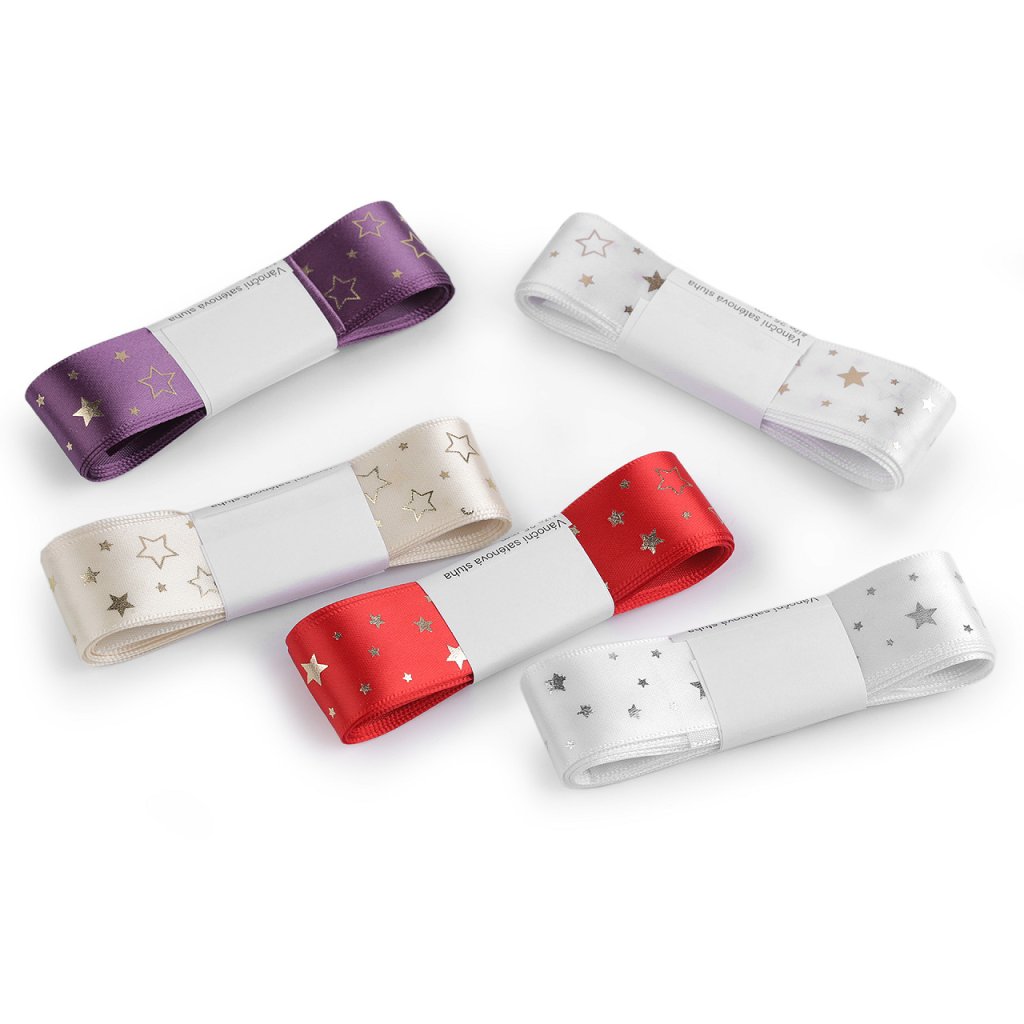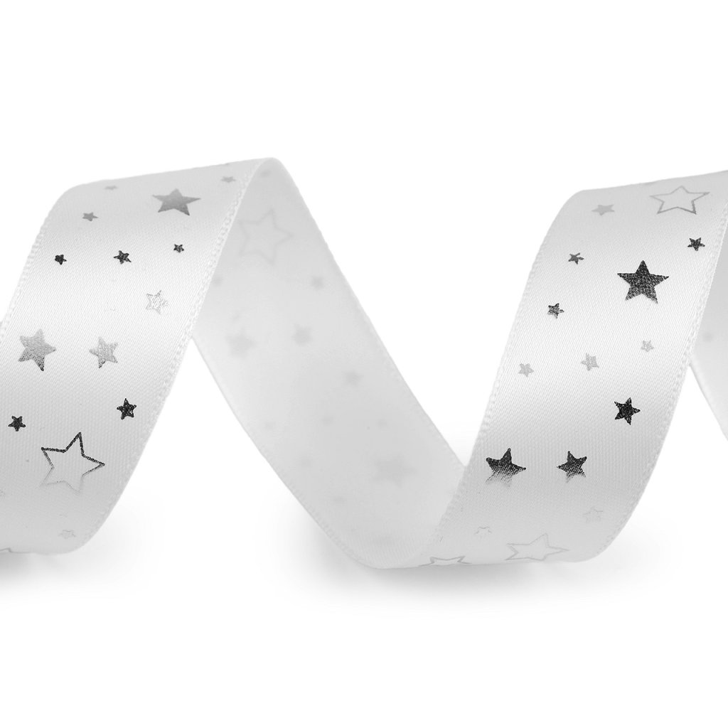 Dekorační saténová stuha s potiskem hvězdiček je velice atraktivní, bude se skvěle vyjímat nejen u vánočních dekorací. Potisk je jednostranný, metalický, připomíná lurex.