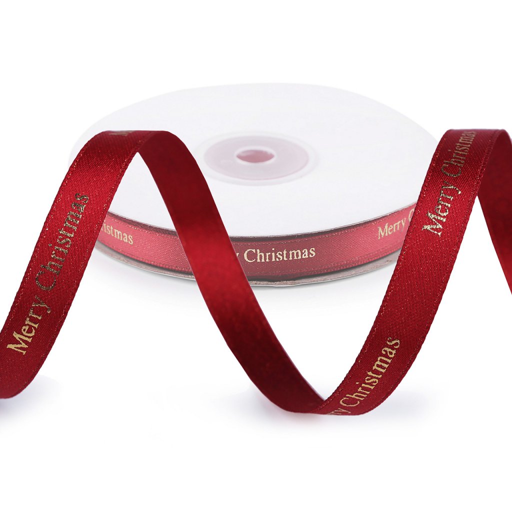 Dekorační stuha je ozdobená metalickým potiskem s nápisem "Merry Christmas". Potisk je jednostranný, stuha se jemně třpytí.