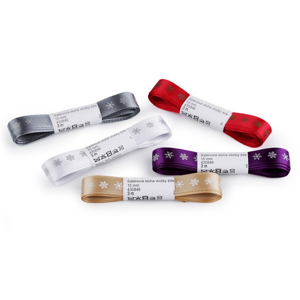 Vánoční saténová stuha vločky šíře 15 mm