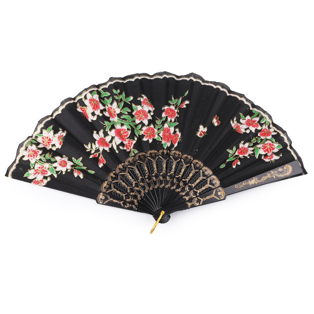 Textilní vějíř zdobí potisk květů, který je doplněný třpytivými glitry. Využijete ho na společenské události, na karnevaly i různá taneční vystoupení. Rukojeť je plastová s poutkem.