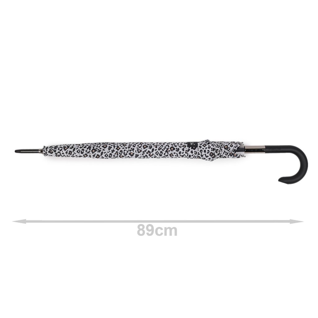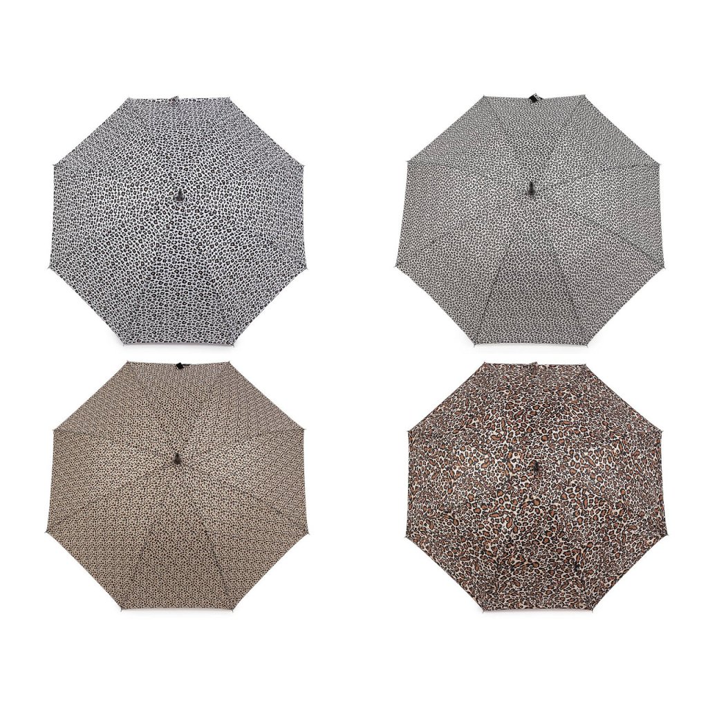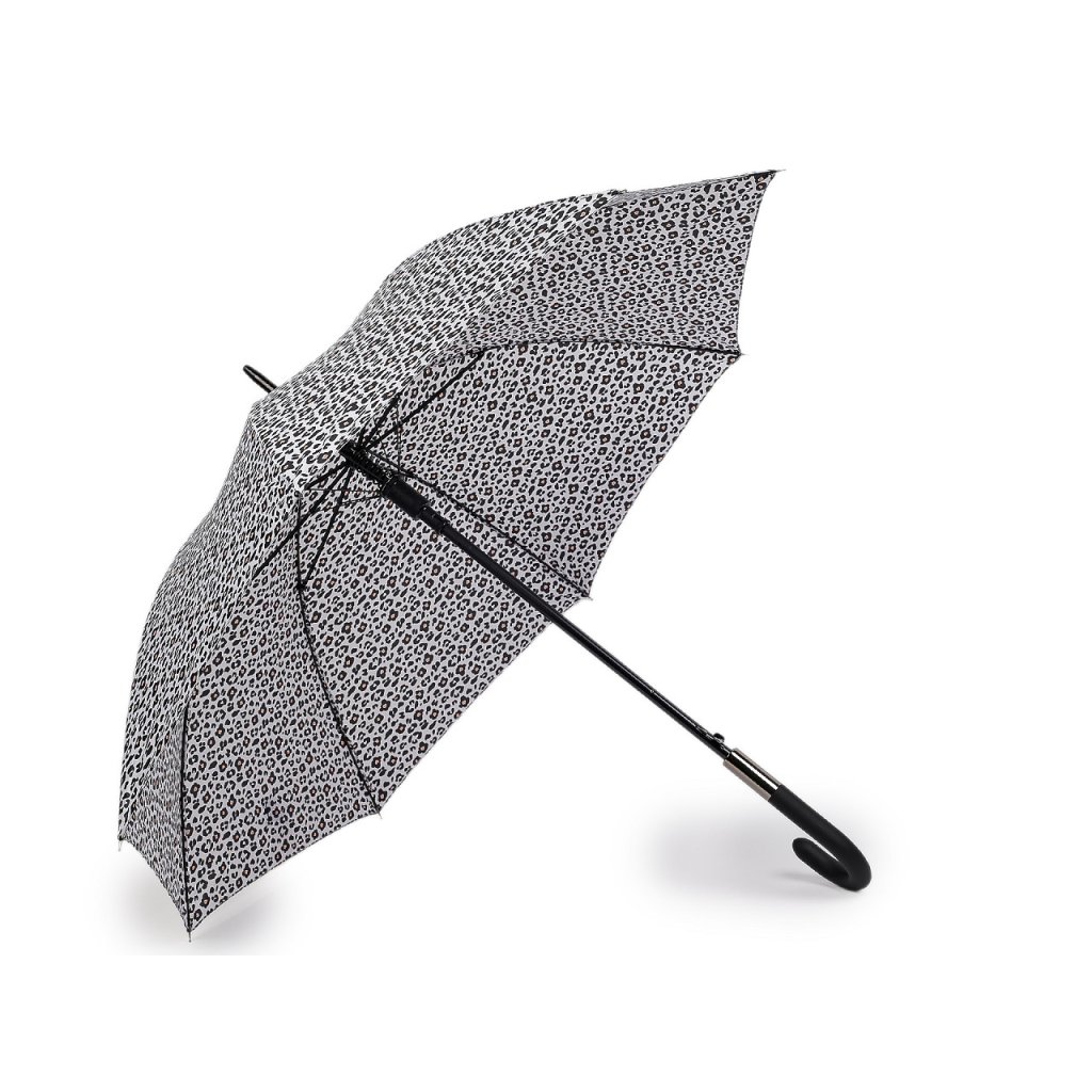Velký dámský deštník se zvířecím vzorem je stylovým a praktickým doplňkem pro každou ženu. Díky svému atraktivnímu designu, dodá šarm i těm nejzamračenějším dnům. Je vystřelovací, konstrukci má z kovového drátu a pružných lamel, které tvoří osm polí. Díky nim je velice pevný, neohne se ani za největšího nečasu. UV filtr vás ochrání před slunečním zářením. Klasická tyč je zakončená pevnou rukojetí.