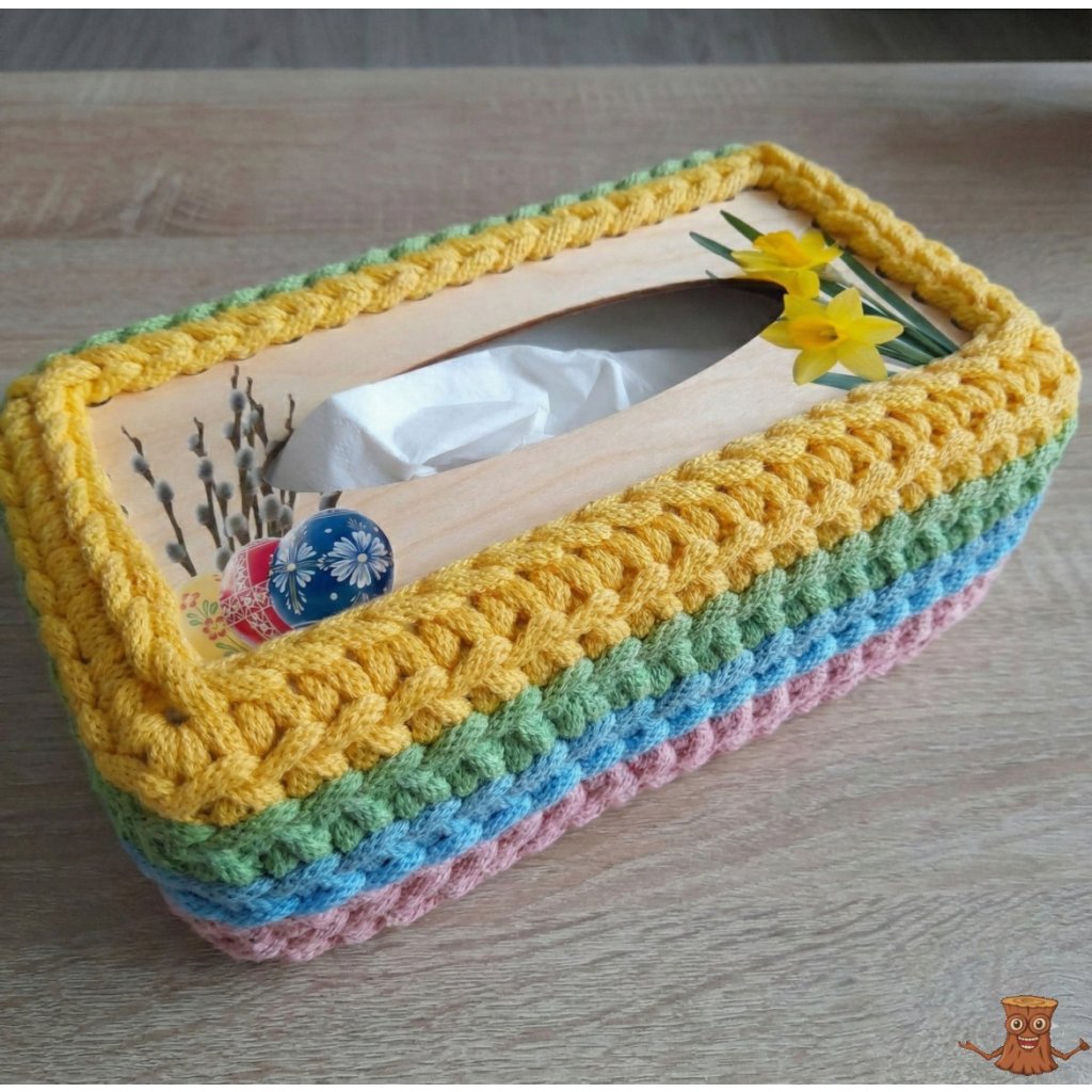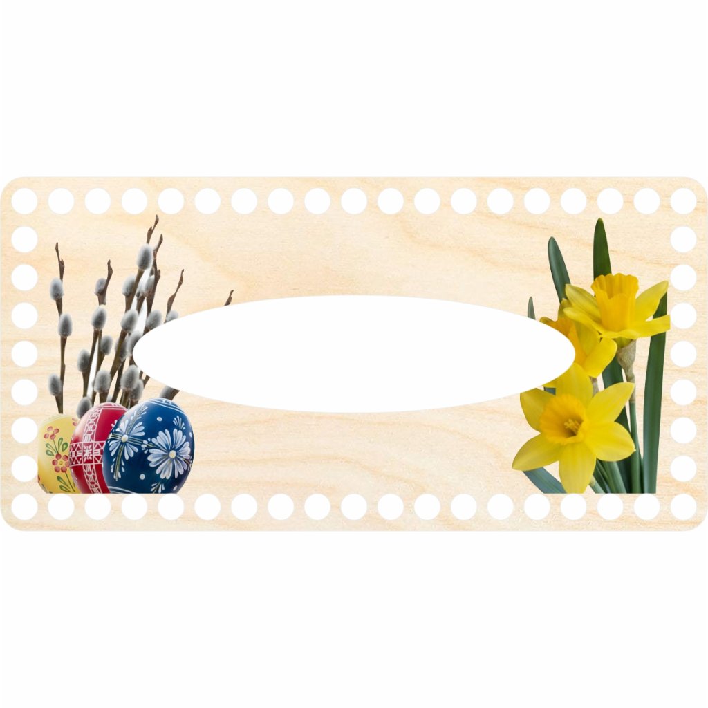 Obdélníkové víko na kapesníky o rozměru 24x12 cm je vyrobeno z březové překližky s barevným jarním potiskem. Ideální základ pro háčkované obaly na kapesníkové boxy s otvory pro snadné napojení příze.