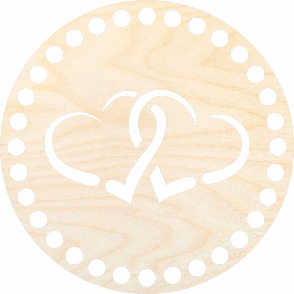 Víko s motivem dvou srdíček pro košíky vyráběné ze špagetových přízí. Motiv je vyřezán laserovou technologíí do víčka z březové překližky.