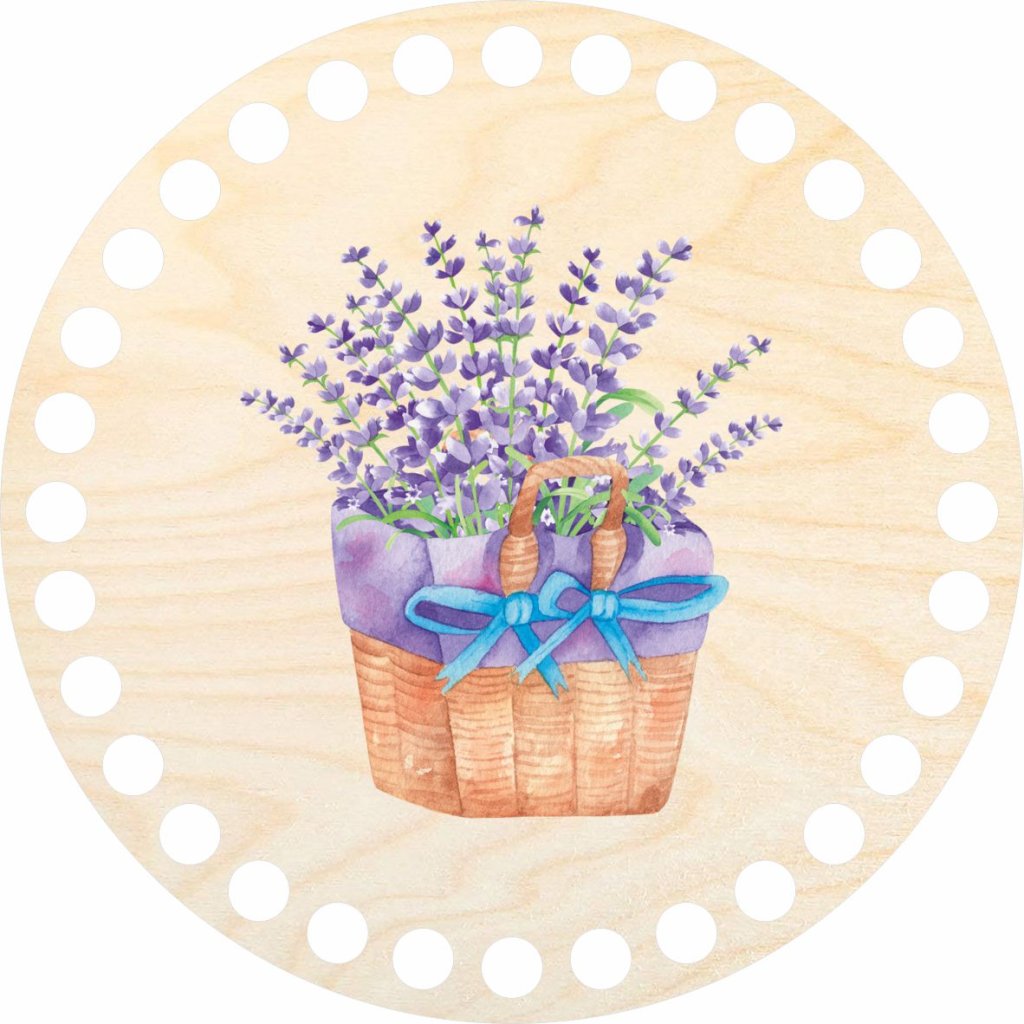 Víko s motivem levandulového koše pro košíky vyráběné ze špagetových přízí. Motiv je vytištěn UV tiskárnou na víko z březové překližky.