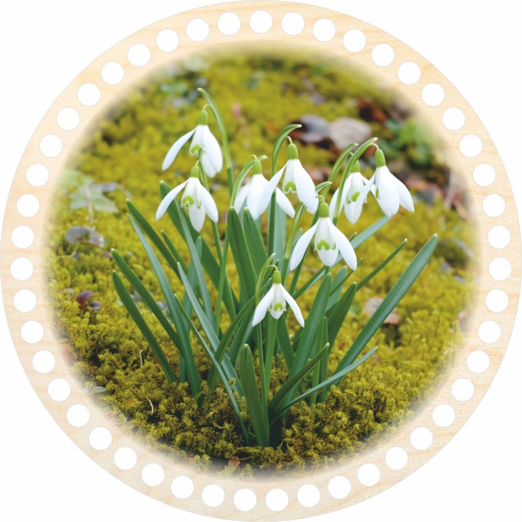 Víko s jarním motivem sněženek pro košíky vyráběné ze špagetových přízí. Motiv je vytištěn UV tiskárnou na víko z březové překližky.