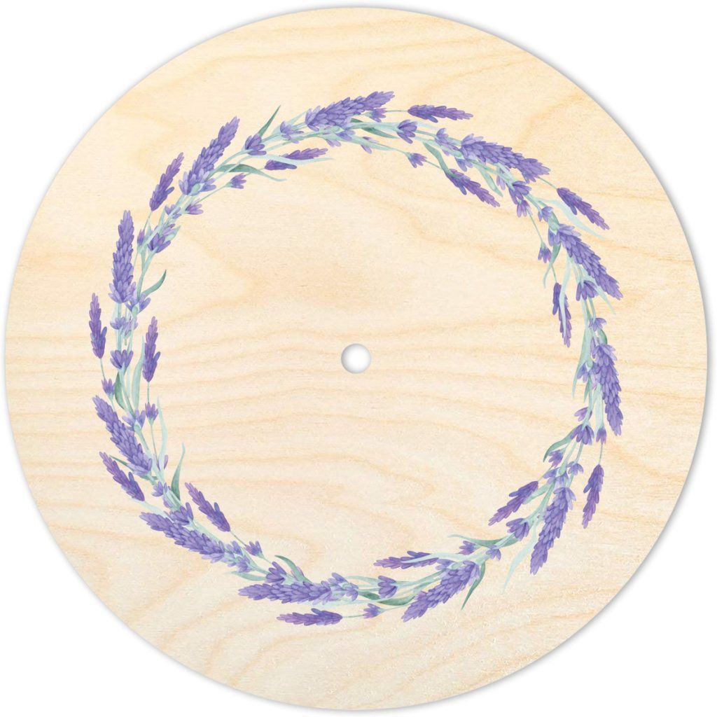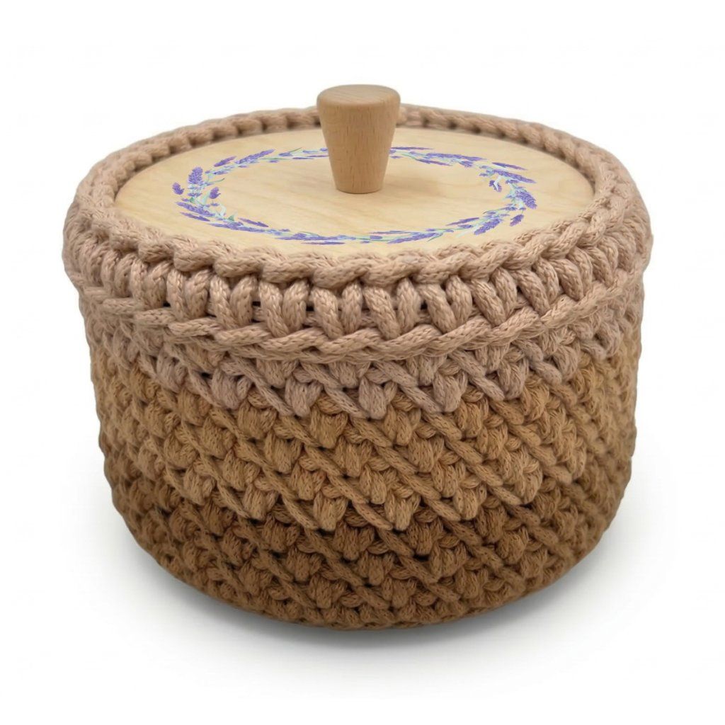 Víko s motivem "Levandulový kruh" pro košíky vyráběné ze špagetových přízí. Motiv je vytištěn UV tiskárnou na víko z březové překližky.