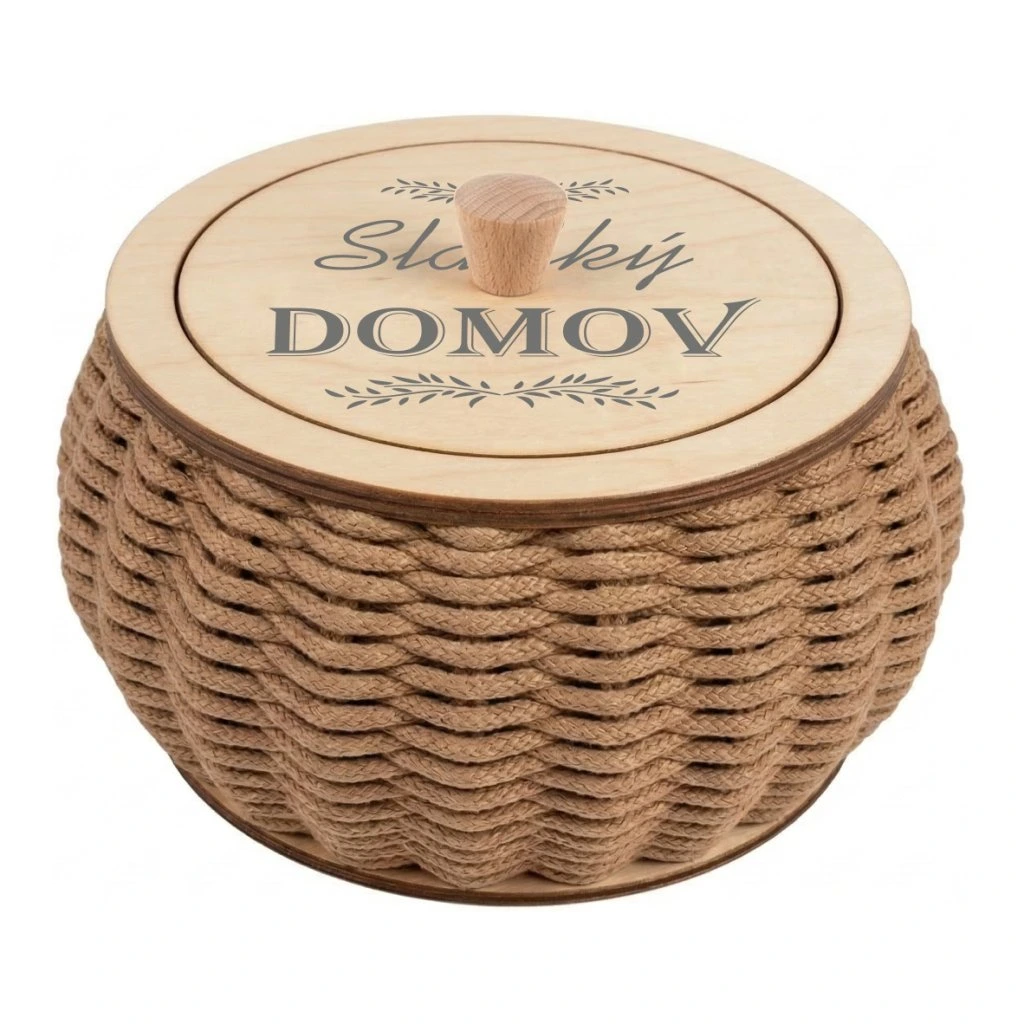 Víko s motivem "Sladký domov" pro košíky vyráběné ze špagetových přízí. Motiv je vytištěn UV tiskárnou na víko z březové překližky.
