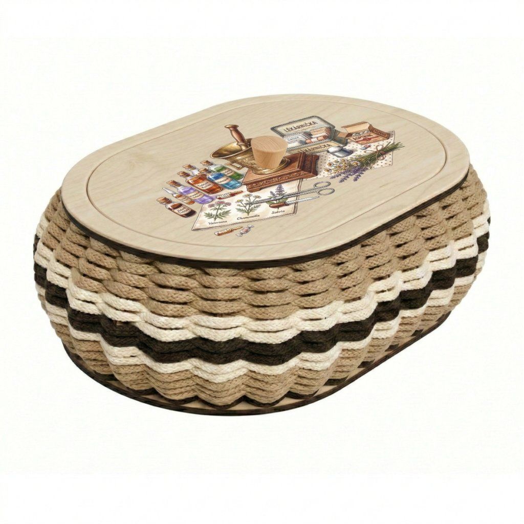 Praktické a esteticky přitažlivé víko na háčkovaný košík, vyrobené z březové překližky s UV potiskem a rozměry 27 x 17 cm, je navrženo pro kombinaci s obručí "OBRUC3020/15" a košíkem "SKLADACKA028", včetně otvoru pro knopku.