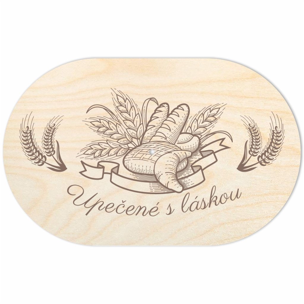 Toto víko na vyplétaný košík je vyřezáno z pevné březové překližky o síle 3 mm a je opatřeno odolným UV potiskem, který zobrazuje teplý a láskyplný motiv pečiva a obilných klásků.