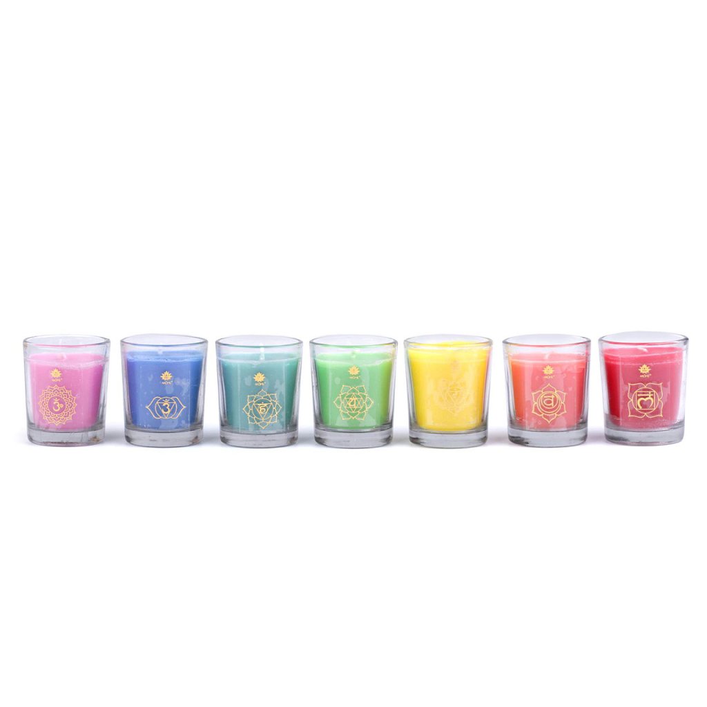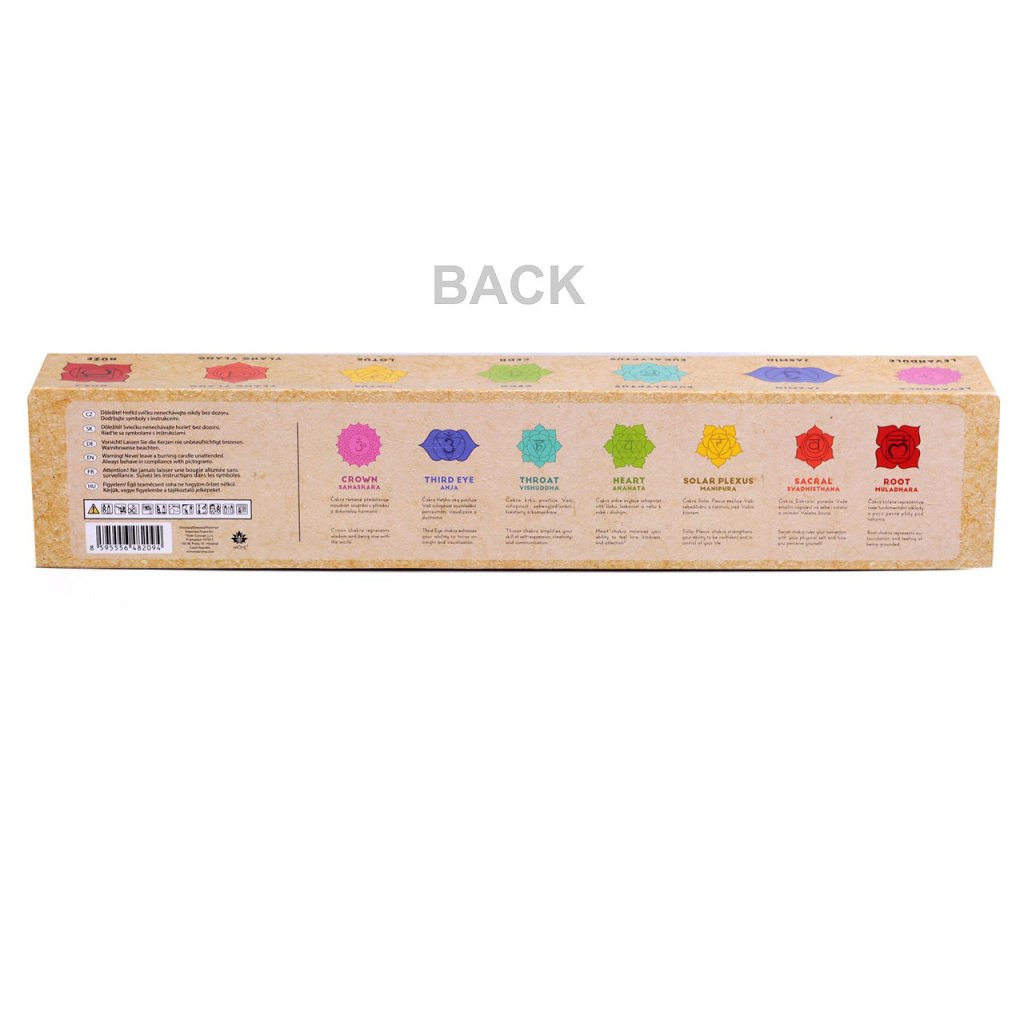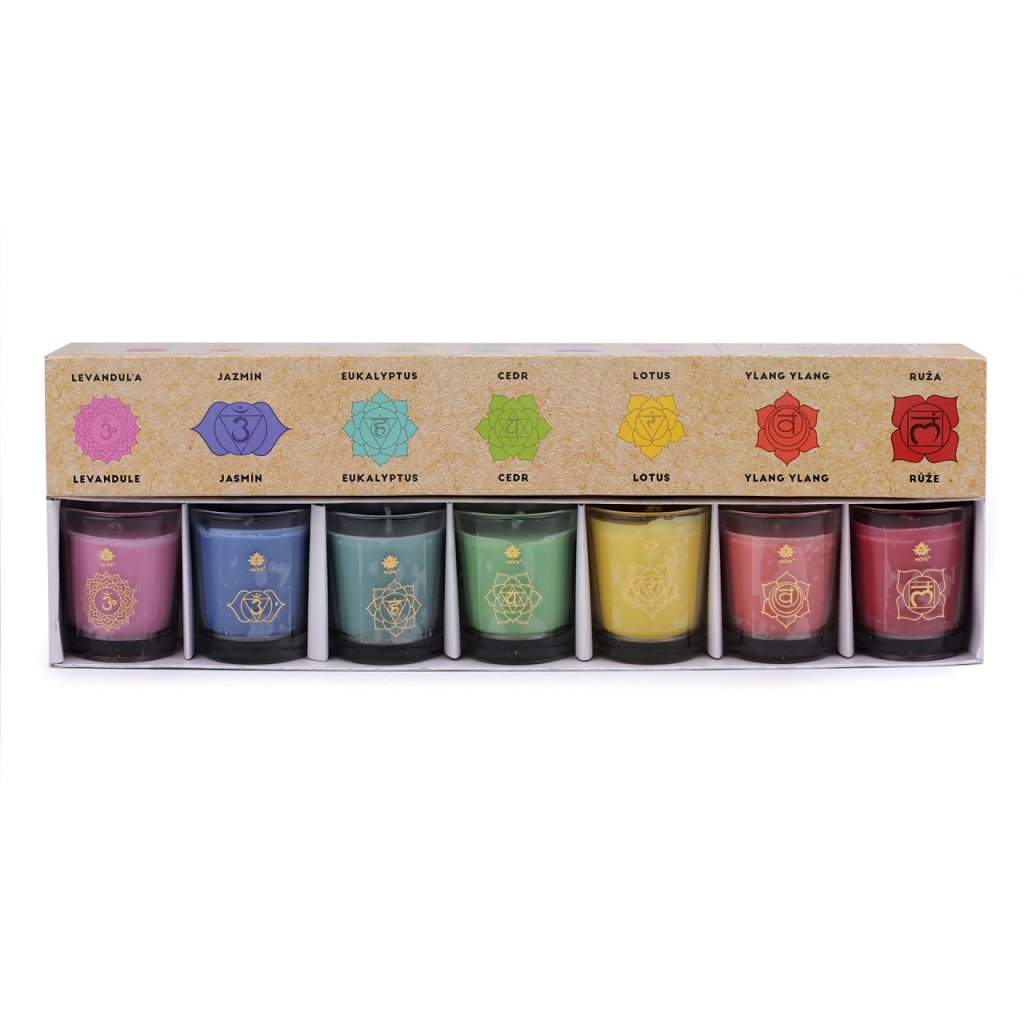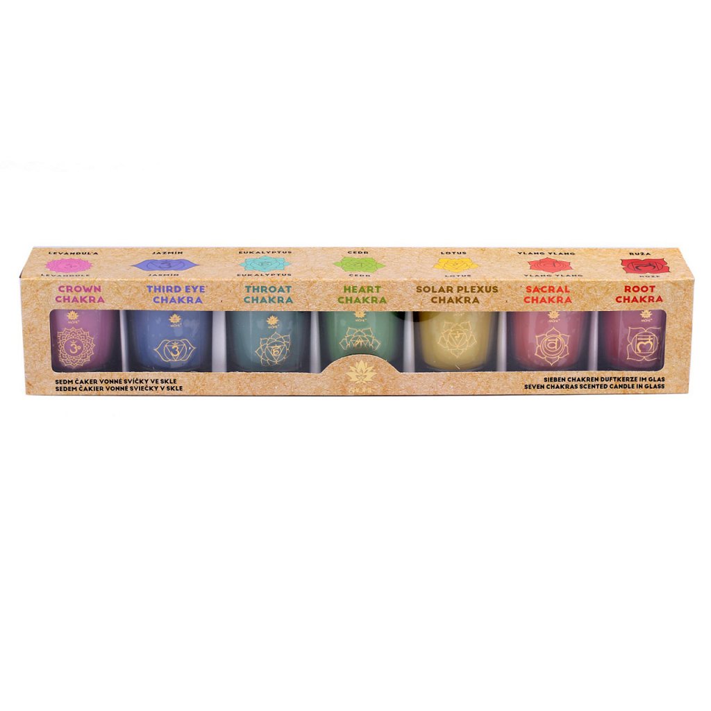 Velká sada vonných čakrových svíček ve skleněných dózách každého potěší. Vykouzlí pohodovou atmosféru, nádherně provoní interiér a zharmonizují život a duševní pohodu. Kromě toho, že jsou svíčky označené příslušnou barvou čakry, mají i samolepky s metalickým potiskem čakrového symbolu. Jsou zabalené v papírové krabičce s transaprentním okénkem s popisem čaker.