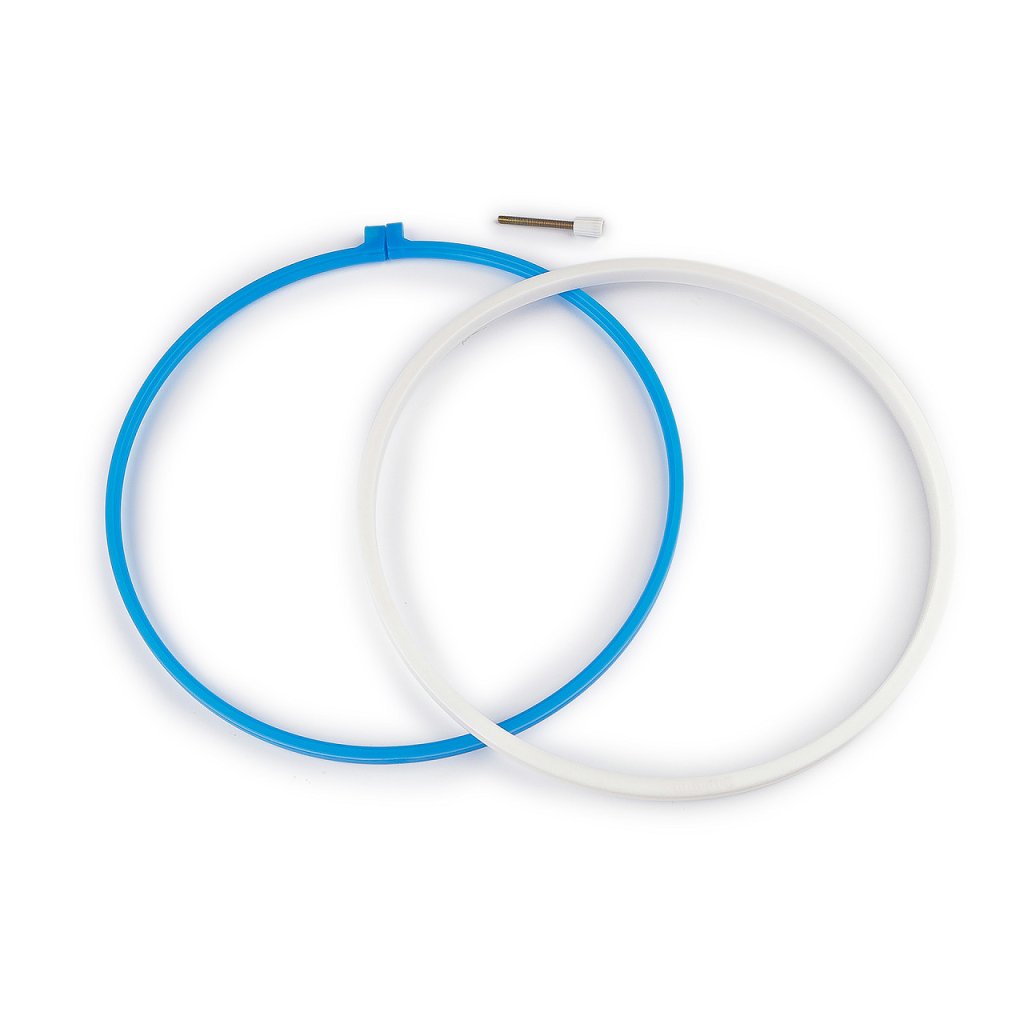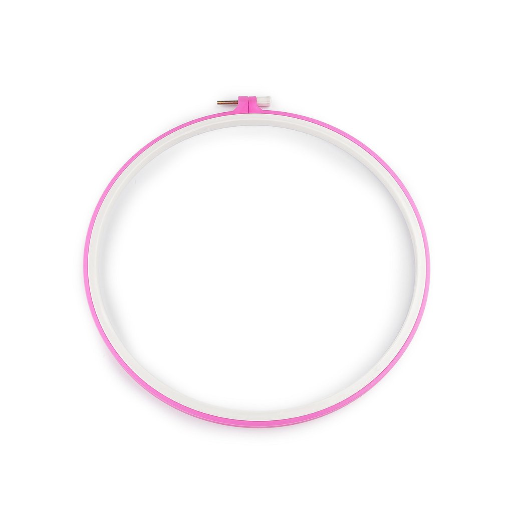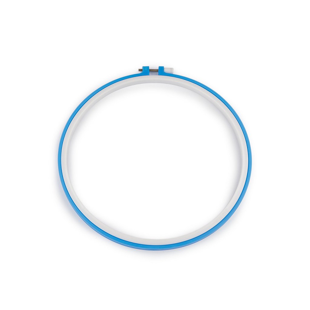 Plastový vyšívací kruh je opatřený kovovým stahovacím šroubkem, pomocí něhož se uchytí vyšívací tkanina.