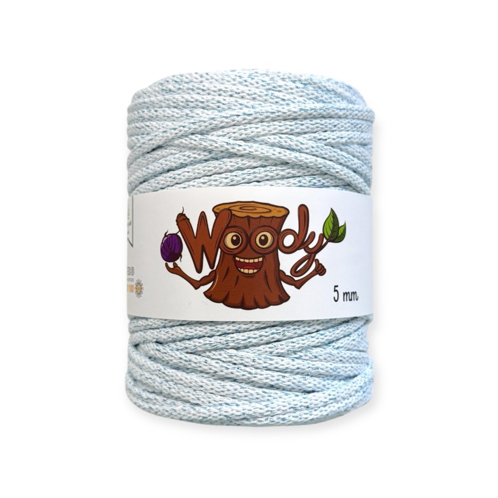 Příze Woody má 100% recyklovaný bavlněný oplet a je vyplněn polyesterovým (PES) jádrem. V opletu je také modrá lurexová nit. Vaše výrobky tak budou pevné a jemné zároveň.