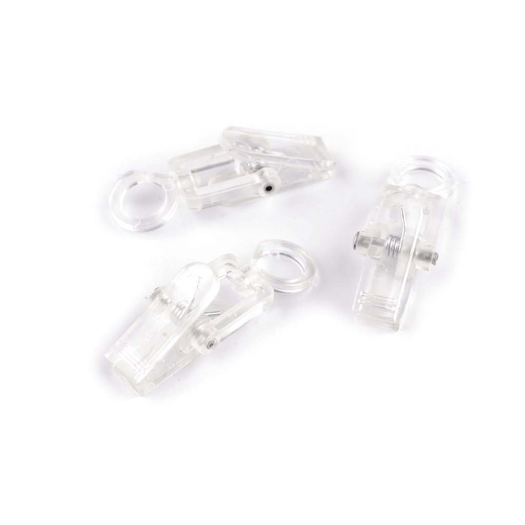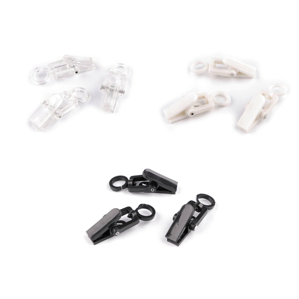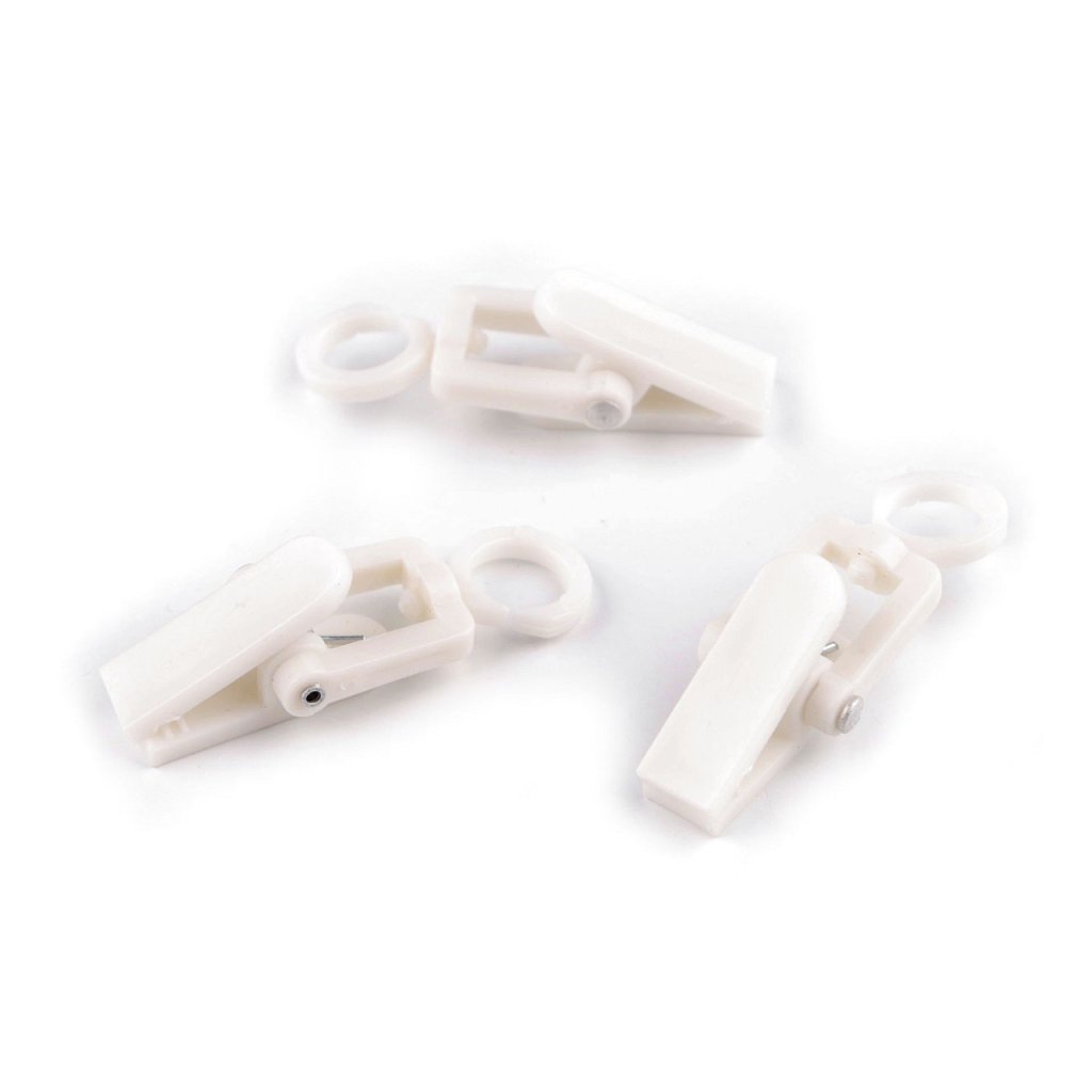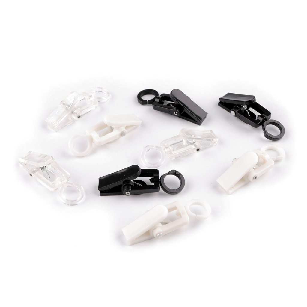 Žabky k uchycení záclon mají na koncích zoubky, díky kterým dobře drží. Jsou z plastu, takže jsou lehké. Očka na žabkách jsou otočná.