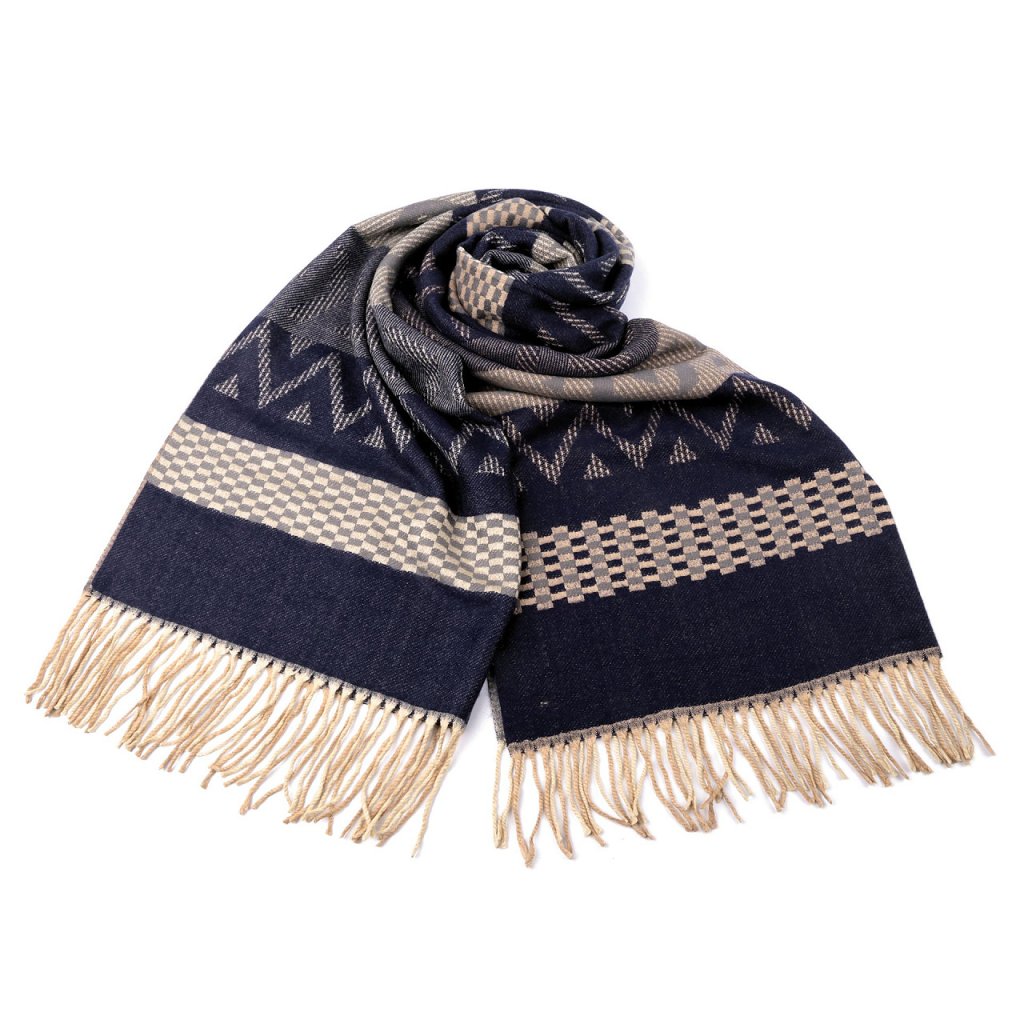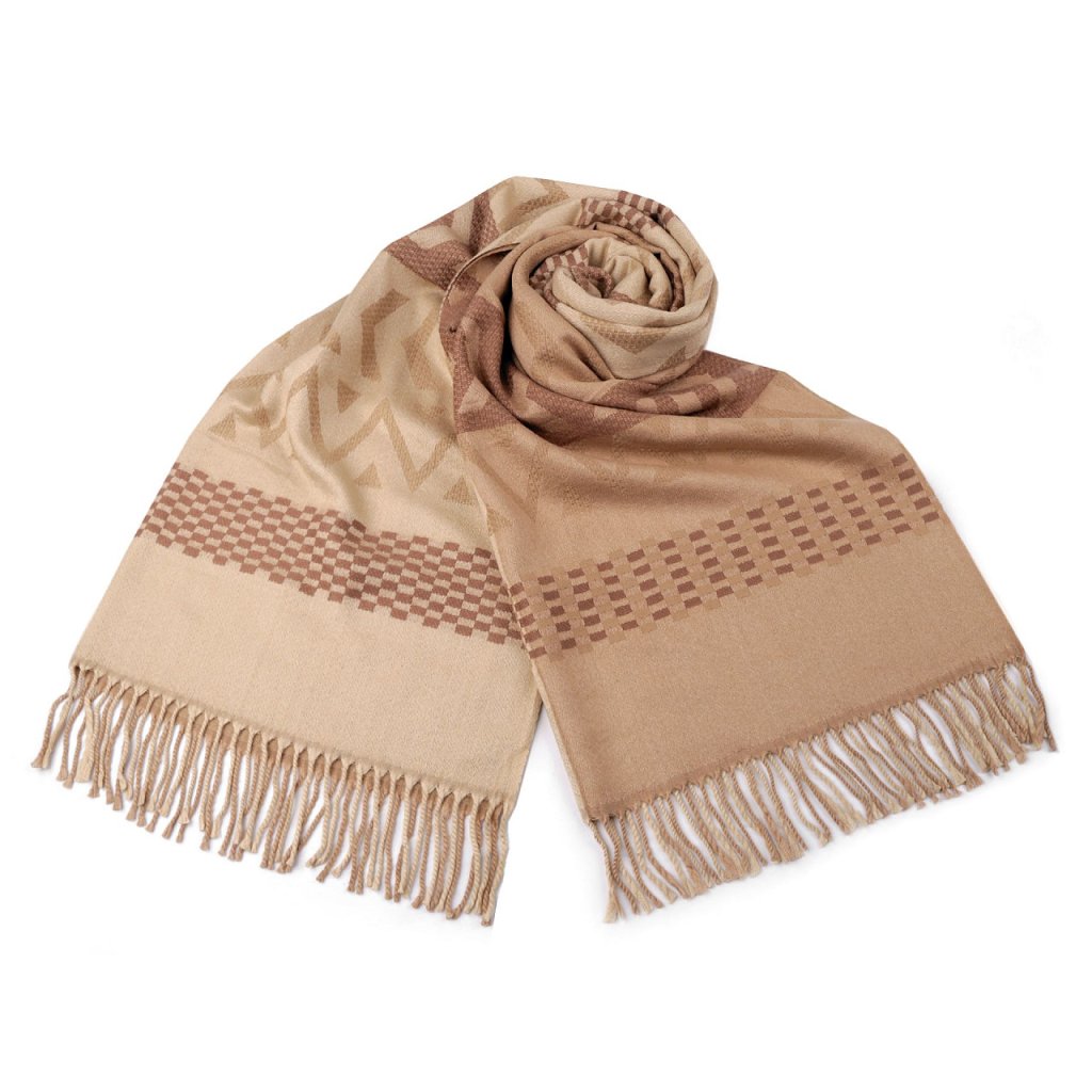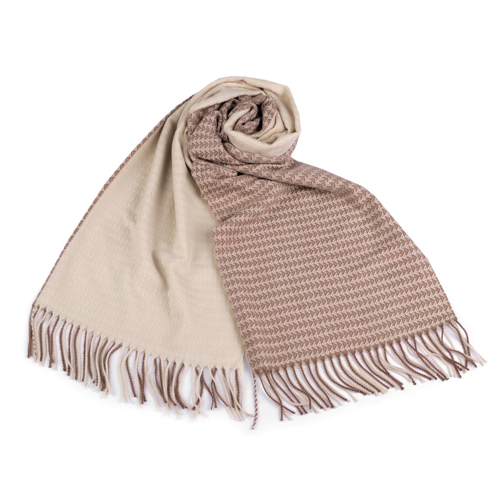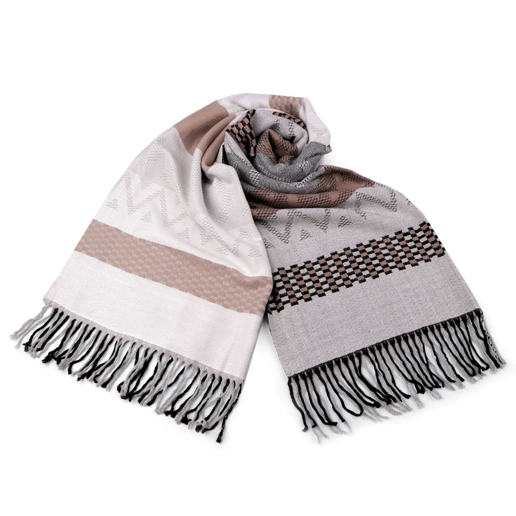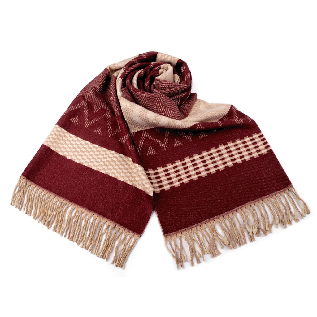 Oboustranná vzorovaná šála vás perfektně zahřeje v sychravých dnech. Je vyrobená z příjemně měkkého a jemného materiálu. Na koncích je zakončená dlouhými třásněmi.