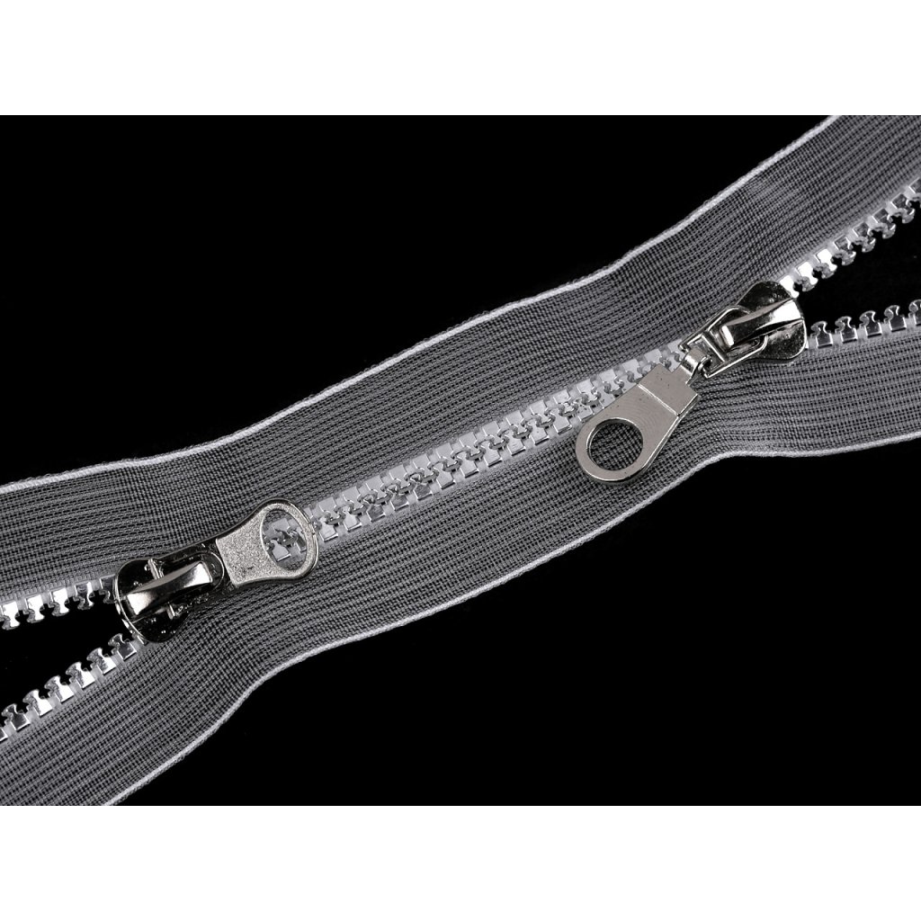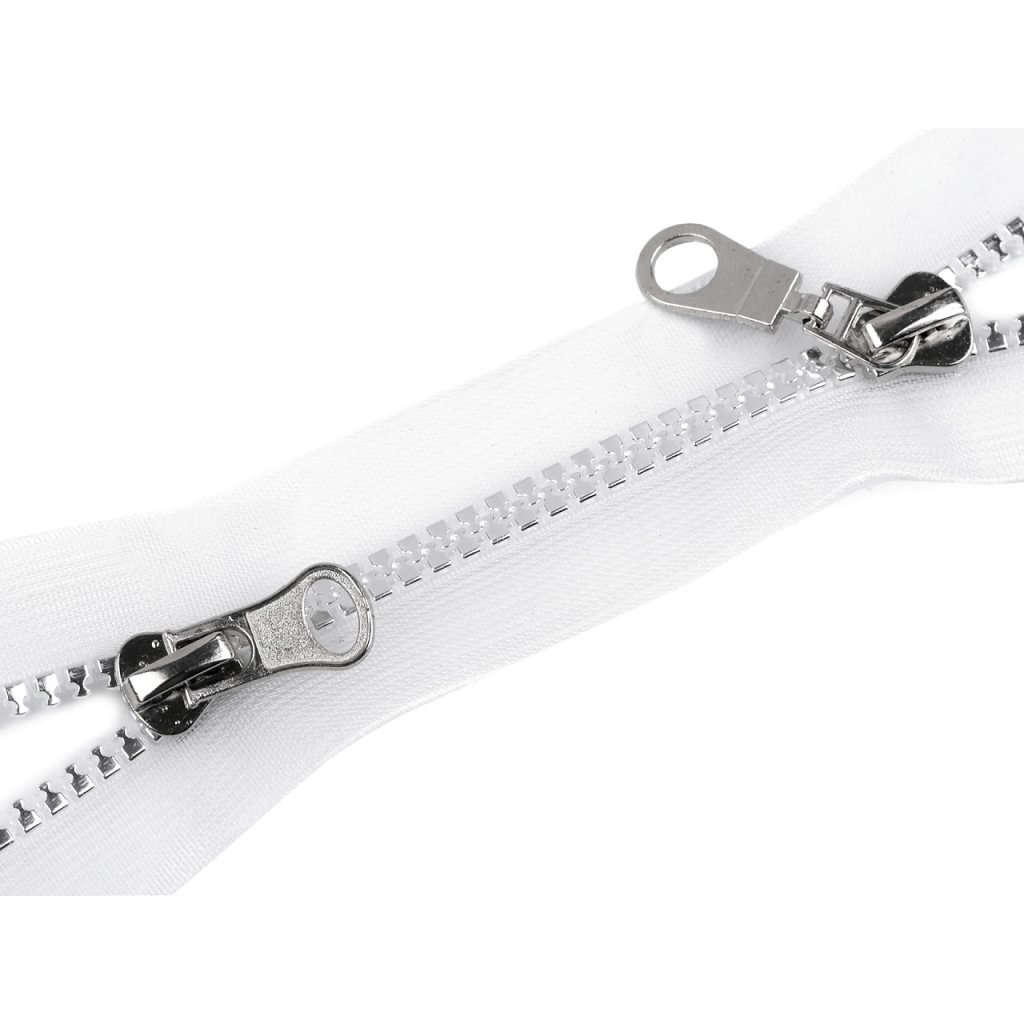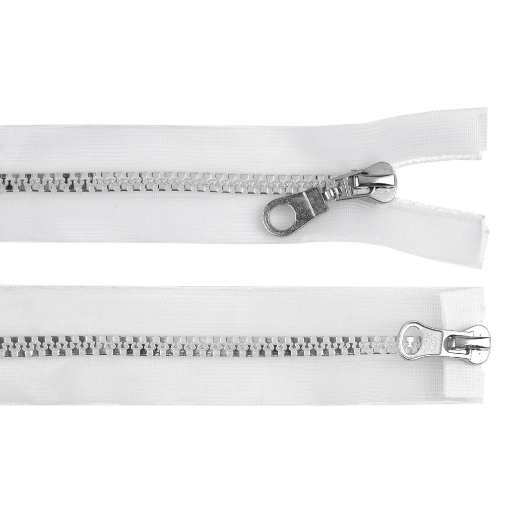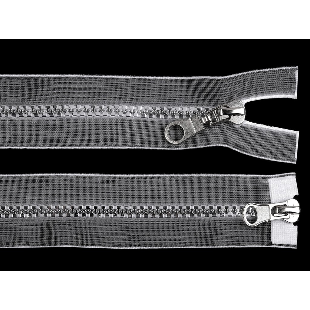 Transparentní kostěný zip se 2 jezdci můžete rozepnout z obou stran. Využijete ho na bundy, vesty nebo kabáty. Zoubky jsou stříbrné. Jezdce nejsou stejné, liší se.